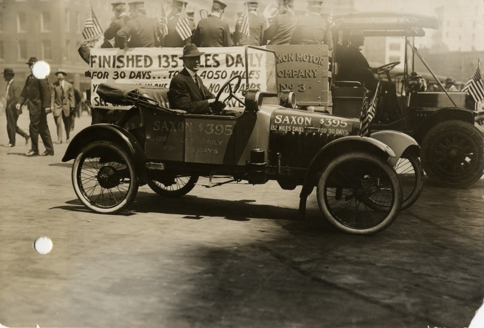 View of M.A. Croker posing in 1914 Saxon car after 30 day endurance run of 135 miles. Saxon Motor Company truck with musicians in background. Painted on side of car: "Saxon, $395, 132 miles daily for 30 days." Banner on truck reads [in part]: "Finished 135 miles daily for 30 days ... 4050 miles ... no repairs." Stamped on back: "Spooner & Wells, Inc., photographers, 1231 Woodward Ave., Detroit, Mich." Handwritten on back: "Saxon. M.A. Croker, driver of 135 mile a day Saxon car."