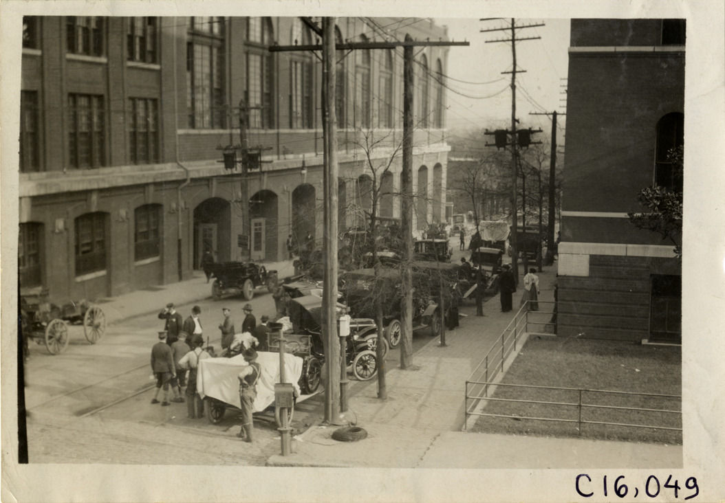 View of cars parked in front of the Atlanta Auditorium and Armory, during the 1909 Atlanta Auto Show in Georgia. Group of men gather around car in foreground. Stamped on back: "Spooner & Wells, Inc., photographers, telephones 3472-3473 Columbus, 1931 Broadway, New York." Handwritten on back: "Shows--Atlanta Auto Show, 1909."