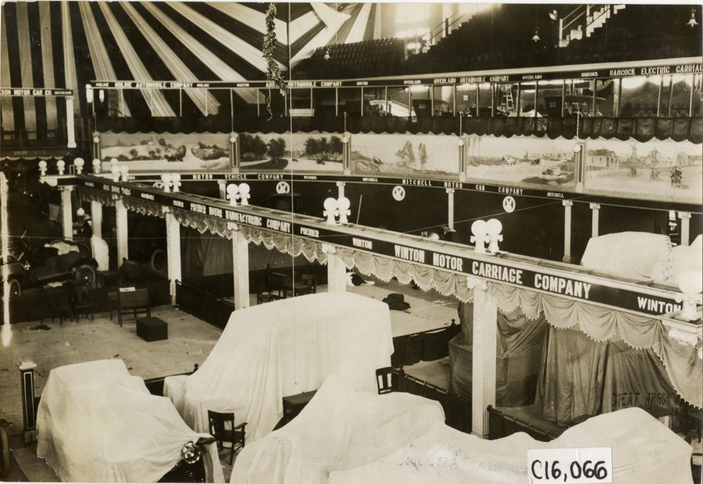 View of Winton cars, covered with tarpaulins, in the Winton Motor Carriage Company exhibit area during installation of the 1909 Atlanta Auto Show at the Atlanta Auditorium and Armory in Georgia. Murals and signs for automobile companies displayed on walls. Handwritten on back: "Shows--Atlanta Auto Show, 1909."