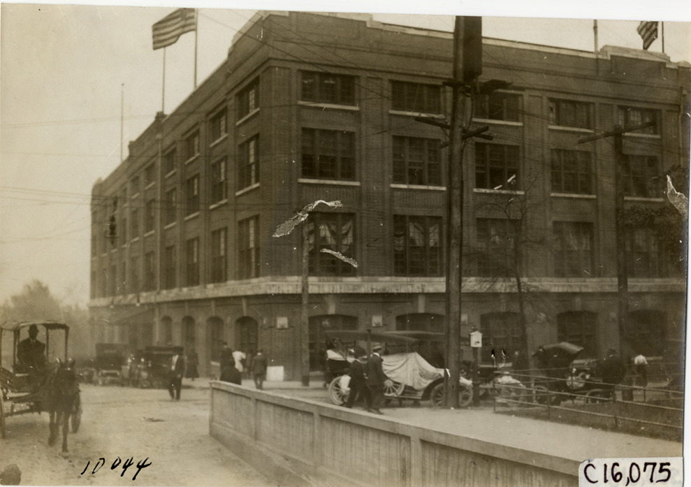 View of cars parked in front of the Atlanta Auditorium and Armory, during the 1909 Atlanta Auto Show in Georgia. Horse-drawn carriage on left. Handwritten on back: "Shows--Atlanta Auto Show, 1909."
