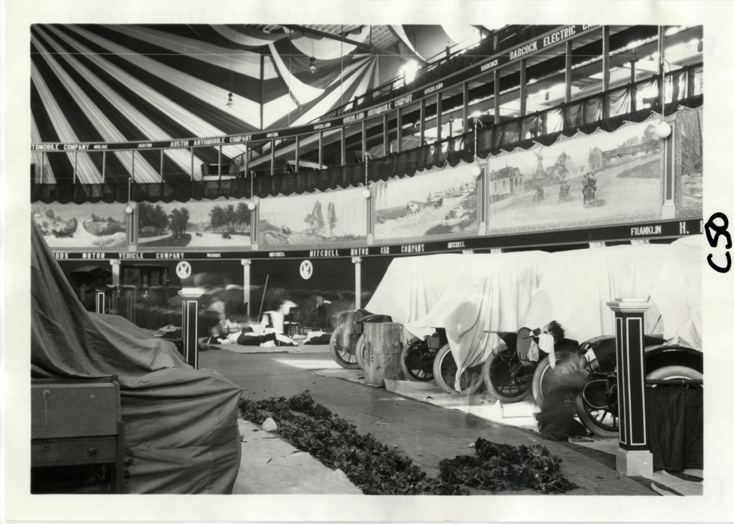 View of trucks, covered with tarpaulins, in H.H. Franklin Manufacturing Company exhibit area during installation of the 1909 Atlanta Auto Show at the Atlanta Auditorium and Armory in Georgia. Murals and signs for automobile companies displayed on walls. Handwritten on back: "Shows--Atlanta Auto Show, 1909."