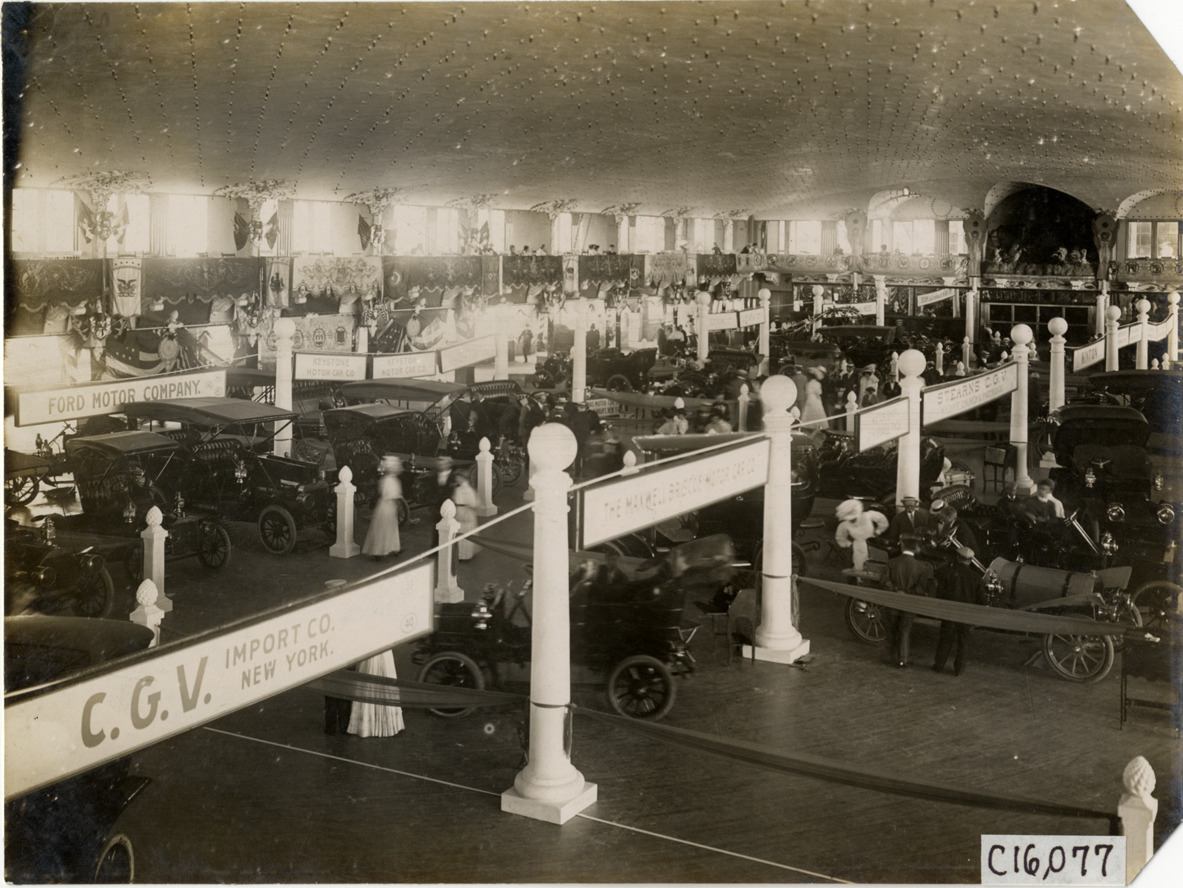 View of cars on exhibit at the 1907 Atlantic City Auto Show in New Jersey. "C.G.V. Import Co.," "The Maxwell Briscoe Motor Car Co.," "Stearns C.G.V.," and "Ford Motor Company" signs in foreground. Stamped on back: "Photo by N. Lazarnick, 29 West 42nd Street, N.Y., tel. 594 Bryant." Handwritten on back: "Shows--Atlantic City Auto Show, 1907."