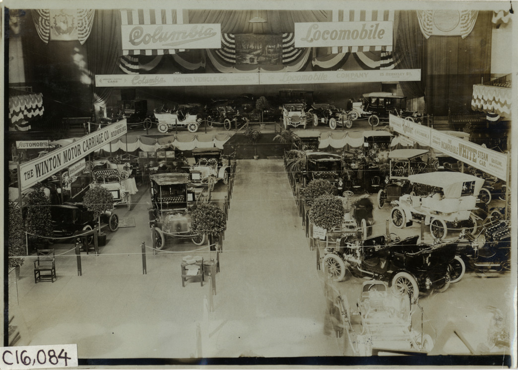 Bird's-eye view of Winton, Rambler and White cars on display during the 1905 Boston Auto Show at Mechanics Hall in Boston, Massachusetts. "Columbia" and "Locomobile" banners displayed in background. Handwritten on back: "Shows--Boston Auto Show, 1905."