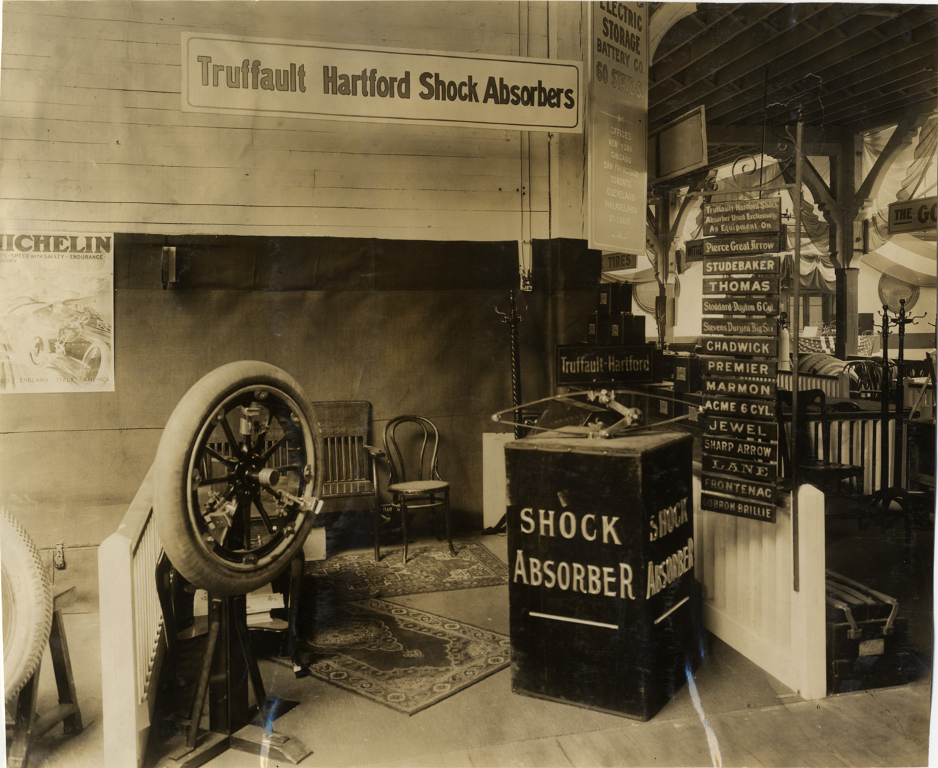 View of exhibit of Truffault-Hartford shock absorbers, manufactured by Hartford Suspension Company, during the 1909 Boston Auto Show at Mechanics Hall in Boston, Massachusetts. Shock absorber displayed on pedestal; automobile wheel attached to frame. Sign listing automobiles that use Truffault-Hartford shock absorbers on right. Stamped on back: "Spooner & Wells, Inc., photographers, telephones 3472-3473 Columbus, 1931 Broadway, New York." Handwritten on back: "Shows--Boston Auto Show, 1909."