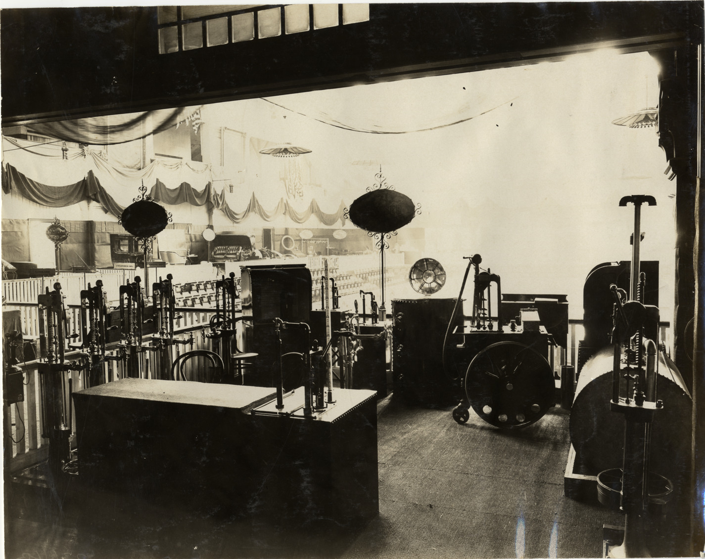View of unidentified motor oil exhibit during the 1909 Boston Auto Show at Mechanics Hall in Boston, Massachusetts. Stamped on back: "Spooner & Wells, Inc., photographers, telephones 3472-3473 Columbus, 1931 Broadway, New York." Handwritten on back: "Shows--Boston Auto Show, 1909."