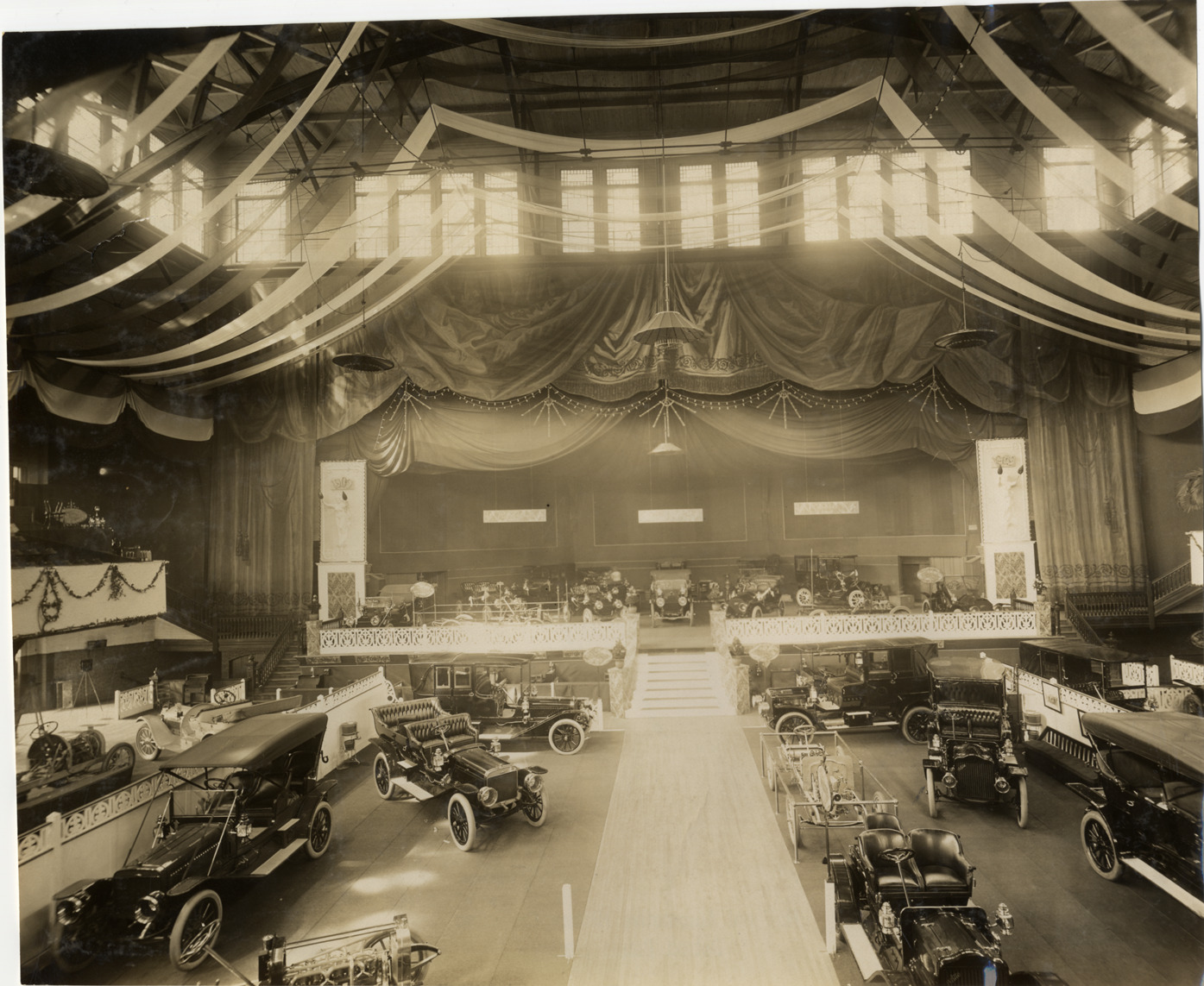 View of cars on exhibit during the 1909 Boston Auto Show at Mechanics Hall in Boston, Massachusetts. Several cars are displayed on stage in background. Stamped on back: "Spooner & Wells, Inc., photographers, telephones 3472-3473 Columbus, 1931 Broadway, New York." Handwritten on back: "Shows--Boston Auto Show, 1909."