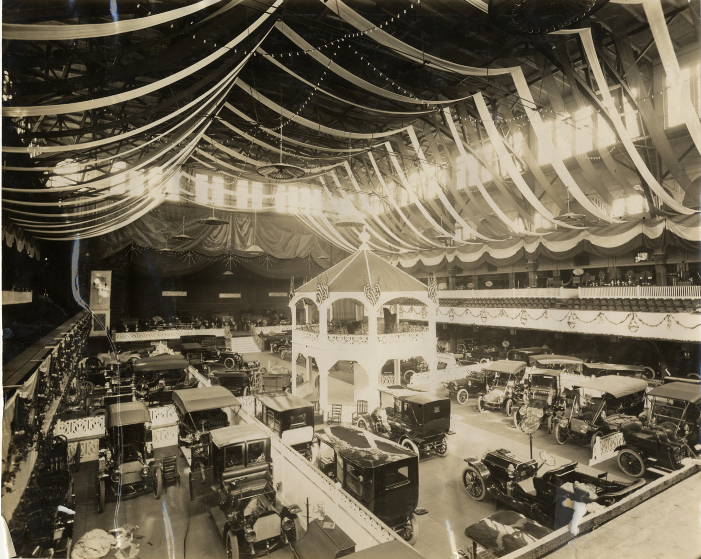 View of cars on exhibit during the 1909 Boston Auto Show at Mechanics Hall in Boston, Massachusetts. Gazebo decorated with American flags in center of room. Stamped on back: "Spooner & Wells, Inc., photographers, telephones 3472-3473 Columbus, 1931 Broadway, New York." Handwritten on back: "General view, Boston Show. Shows--Boston Auto Show, 1909."