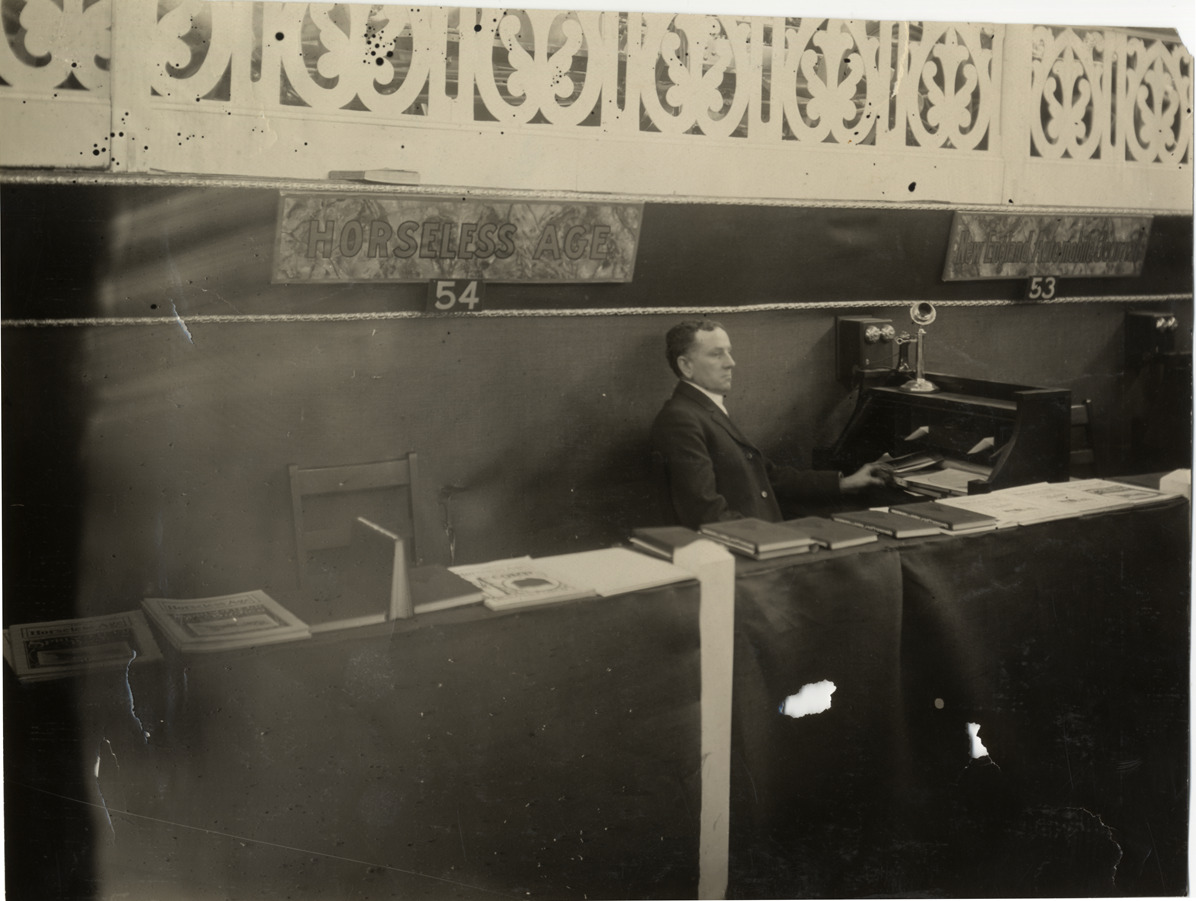 Man in booth for "Horseless Age" magazine, 1909 Boston Auto Show