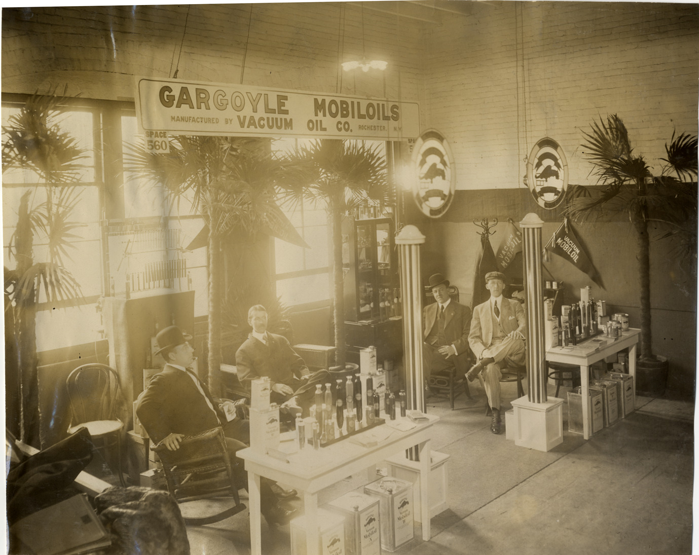 View of four men sitting in Gargoyle Mobiloils exhibit area during the 1909 Boston Auto Show at Mechanics Hall in Boston, Massachusetts. Exhibit area is decorated with oil cans and tubes on tables, stained glass roundels, palms and display cases. "Gargoyle Mobiloils manufactured by Vacuum Oil Co., Rochester, N.Y." sign displayed overhead. Stamped on back: "Spooner & Wells, Inc., photographers, telephones 3472-3473 Columbus, 1931 Broadway, New York." Handwritten on back: "Shows--Boston Auto Show, 1909."