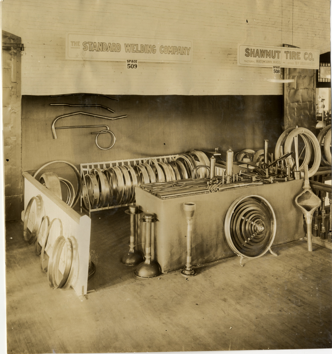 View of tire rims in the Standard Welding Company exhibit during the 1909 Boston Auto Show at Mechanics Hall in Boston, Massachusetts. "The Standard Welding Company" sign in background; "Shawmut Tire Co." sign on right. Stamped on back: "Spooner & Wells, Inc., photographers, telephones 3472-3473 Columbus, 1931 Broadway, New York." Handwritten on back: "Shows--Boston Auto Show, 1909."