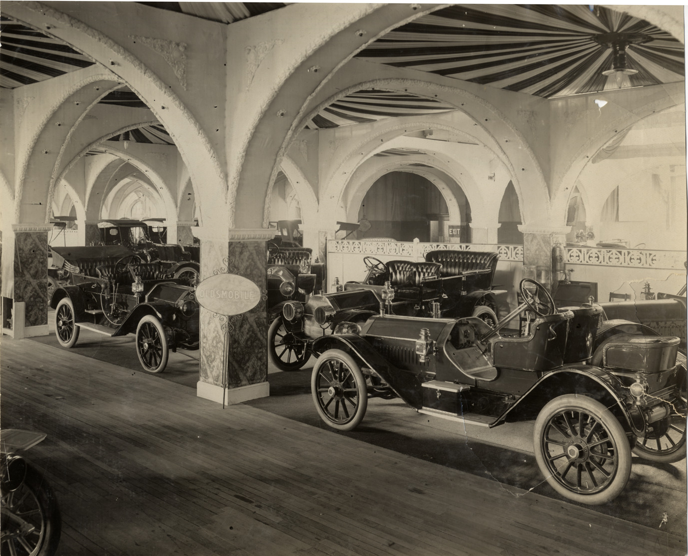 View of Oldsmobile cars on exhibit during the 1909 Boston Auto Show at Mechanics Hall in Boston, Massachusetts. "Oldsmobile" sign in foreground. Stamped on back: "Spooner & Wells, Inc., photographers, telephones 3472-3473 Columbus, 1931 Broadway, New York." Handwritten on back: "Shows--Boston Auto Show, 1909."