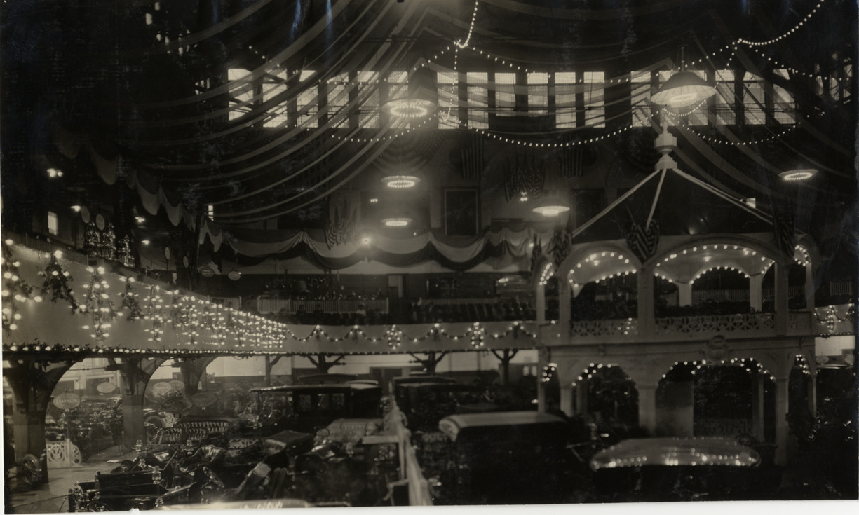 Nighttime view of cars on exhibit during the 1909 Boston Auto Show at Mechanics Hall in Boston, Massachusetts. Exhibit area is illuminated with electric lights on ceiling, balcony and gazebo. Stamped on back: "Spooner & Wells, Inc., photographers, telephones 3472-3473 Columbus, 1931 Broadway, New York." Handwritten on back: "Shows--Boston Auto Show, 1909."