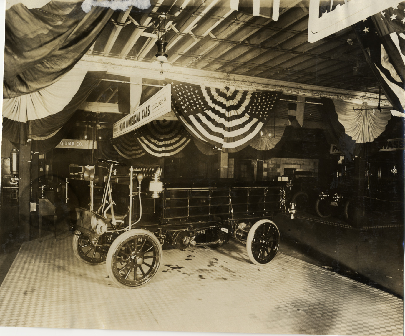View of Knox truck on exhibit during the 1909 Boston Auto Show at Mechanics Hall in Boston, Massachusetts. "Knox commercial cars" sign is displayed over exhibit; ceiling beams are decorated with bunting. Stamped on back: "Spooner & Wells, Inc., photographers, telephones 3472-3473 Columbus, 1931 Broadway, New York." Handwritten on back: "Shows--Boston Auto Show, 1909."