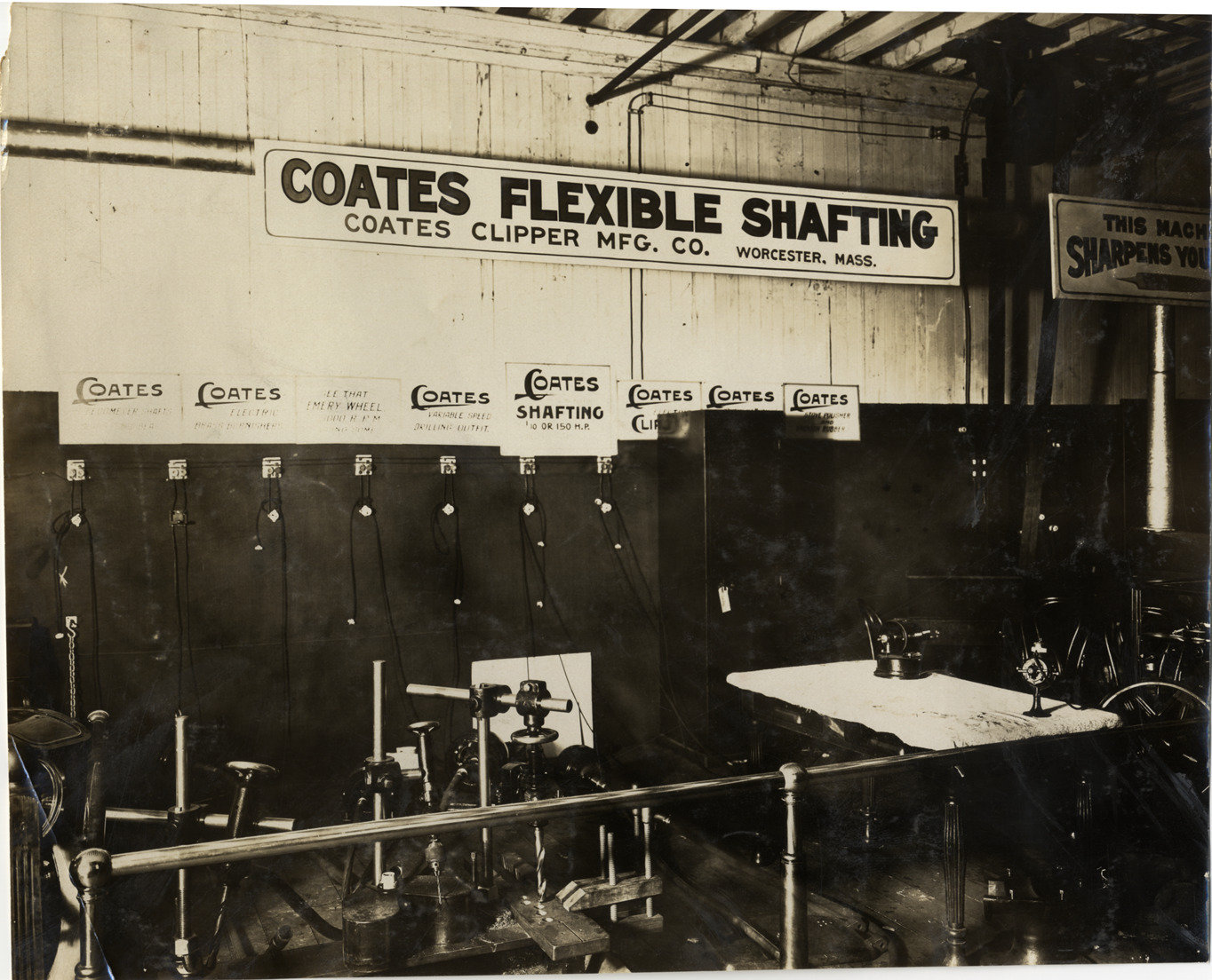 View of Coates Clipper Manufacturing Company exhibit, featuring Coates flexible shafting, during the 1909 Boston Auto Show at Mechanics Hall in Boston, Massachusetts. Drills and other tools driven by electric motors and connected by flexible shafting displayed in exhibit; "Coates flexible shafting, Coates Clipper Mfg. Co., Worcester, Mass." sign in background. Stamped on back: "Spooner & Wells, Inc., photographers, telephones 3472-3473 Columbus, 1931 Broadway, New York." Handwritten on back: "Shows--Boston Auto Show, 1909."