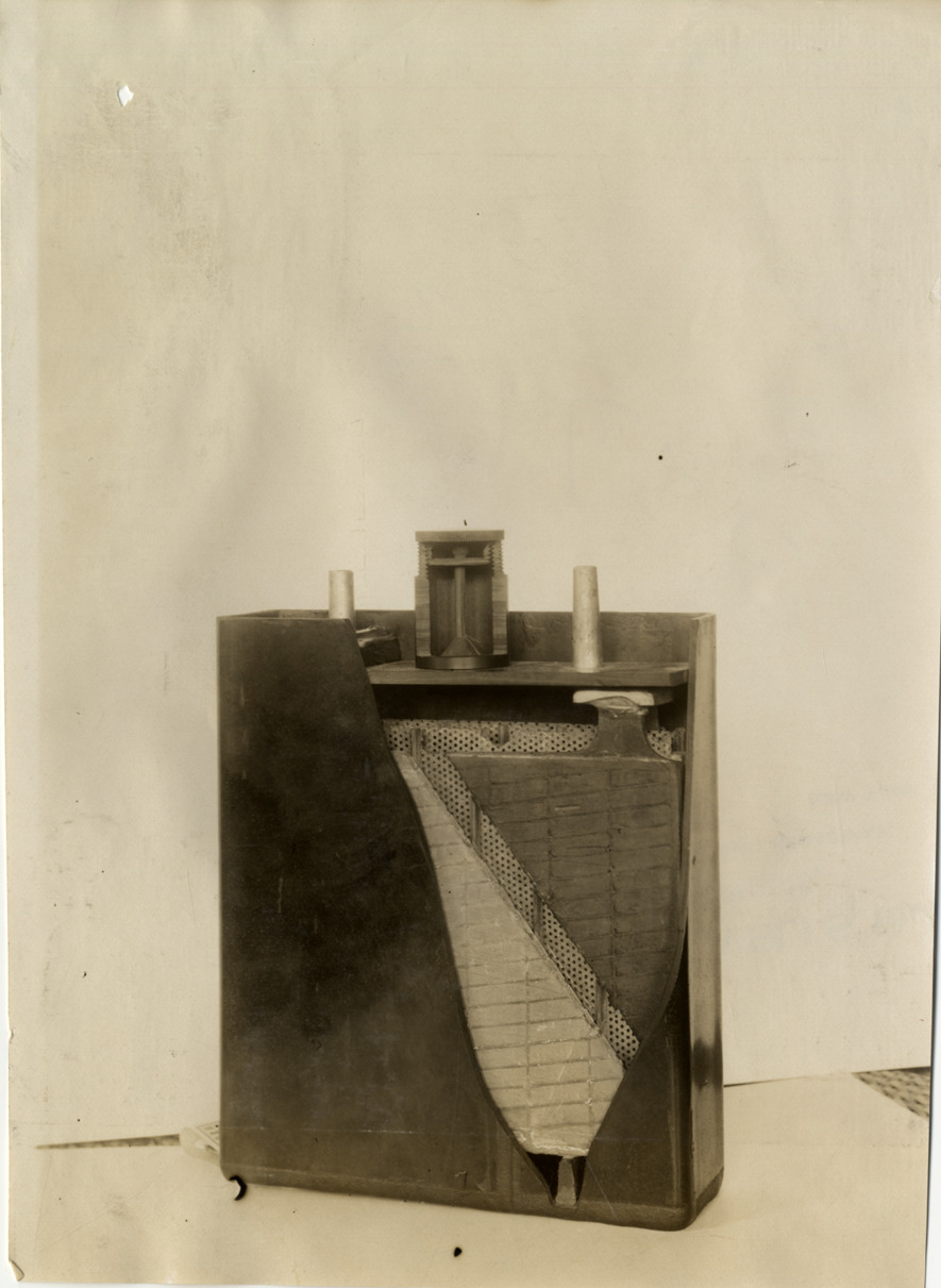 View of unidentified car part during the 1909 Boston Auto Show at Mechanics Hall in Boston, Massachusetts. Stamped on back: "Spooner and Wells, 1931 Broadway, New York, duplicates any time, enlargements all sizes, tel. 3472-3473 Col., credit appreciated." Handwritten on back: "Shows--Boston Auto Show, 1909."
