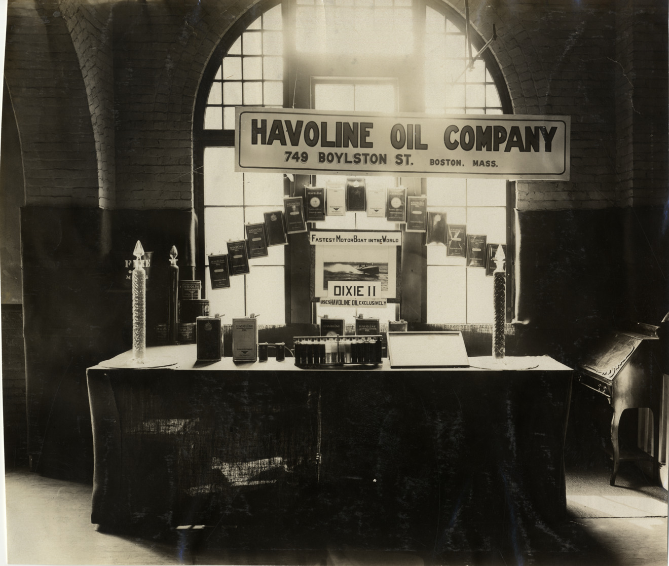View of Havoline Oil Company exhibit during the 1909 Boston Auto Show at Mechanics Hall in Boston, Massachusetts. Exhibit area is decorated with oil cans, decanters and tubes; photograph of the motorboat "Dixie II" is displayed behind table with text: "Fastest motorboat in the world, Dixie II uses Havoline oil exclusively." "Havoline Oil Company, 749 Boylston St., Boston, Mass." sign displayed in background. Stamped on back: "Spooner & Wells, Inc., photographers, telephones 3472-3473 Columbus, 1931 Broadway, New York." Handwritten on back: "Shows--Boston Auto Show, 1909."