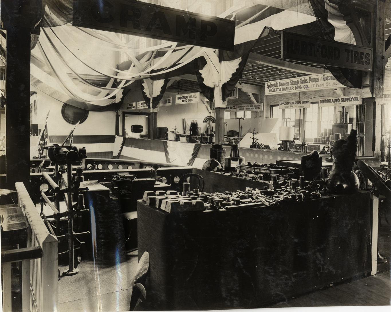 View of Cramp metals exhibit during the 1909 Boston Auto Show at Mechanics Hall in Boston, Massachusetts. "Cramp" sign displayed overhead. Stamped on back: "Spooner & Wells, Inc., photographers, telephones 3472-3473 Columbus, 1931 Broadway, New York." Handwritten on back: "Shows--Boston Auto Show, 1909."