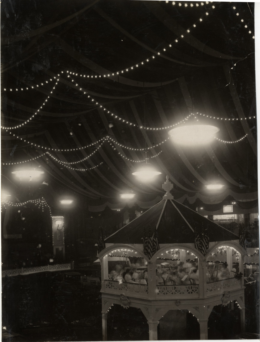 Nighttime view of women musicians in orchestra, performing in gazebo, during the 1909 Boston Auto Show at Mechanics Hall in Boston, Massachusetts. Ceiling and gazebo are decorated with electric lights. Handwritten on back: "Shows--Boston Auto Show, 1909."