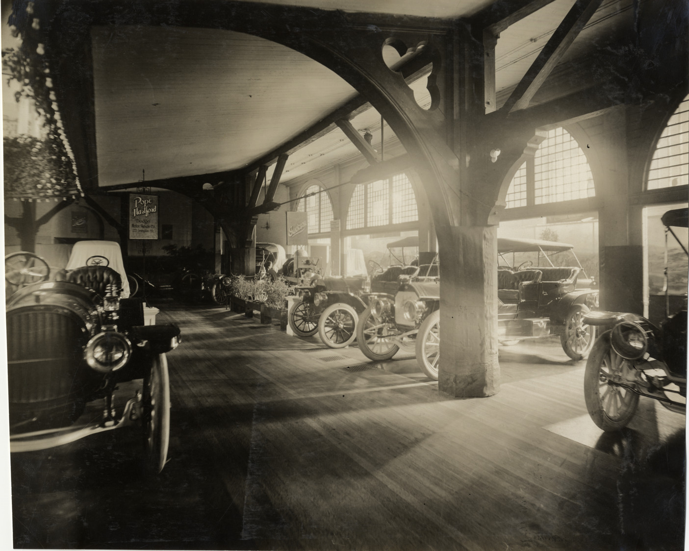 View of Jackson cars on exhibit during the 1910 Boston Auto Show at Mechanics Hall in Boston, Massachusetts. "Jackson" sign displayed in exhibit area; "Pope Hartford, Dodge Motor Vehicle Co., 25 Irvington St." sign in background. Stamped on back: "Spooner & Wells, Inc., photographers, telephones 3472-3473 Columbus, 1931 Broadway, New York." Handwritten on back: "Jackson exhibit. Shows--Boston Auto Show, 1910."
