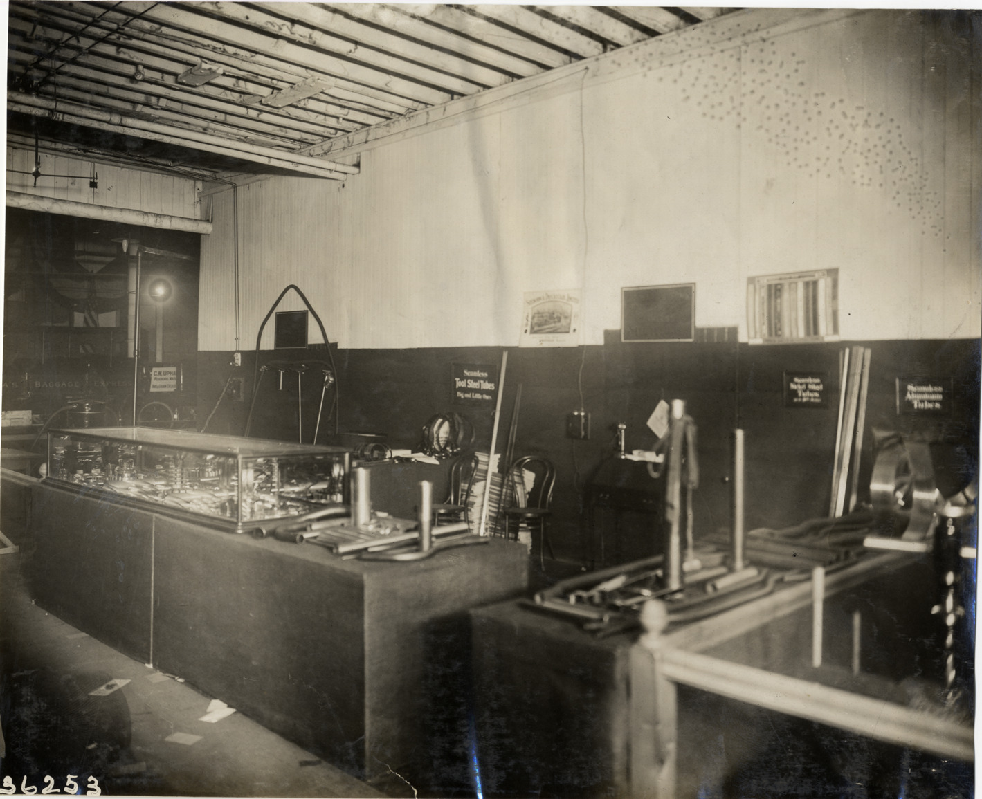 View of display of seamless steel and aluminum tubes during the 1910 Boston Auto Show at Mechanics Hall in Boston, Massachusetts. Stamped on back: "Spooner & Wells, Inc., photographers, telephones 3472-3473 Columbus, 1931 Broadway, New York." Handwritten on back: "Shows--Boston Auto Show, 1910."
