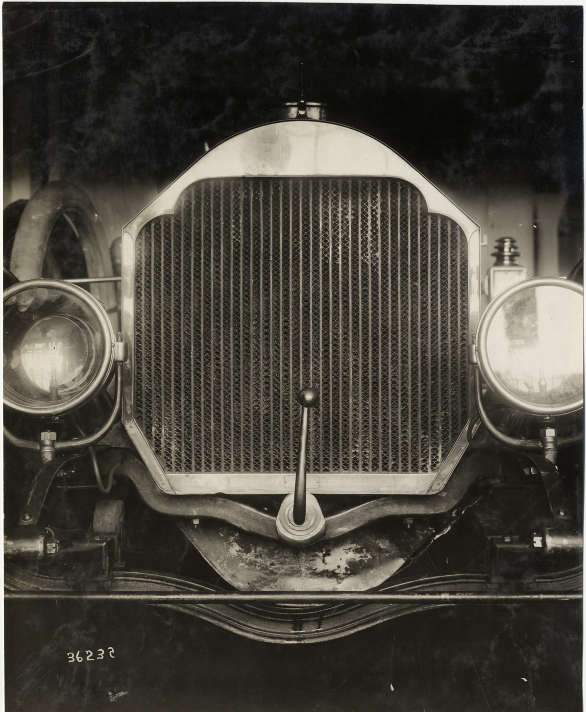 Close-up view of car radiator grille during the 1910 Boston Auto Show at Mechanics Hall in Boston, Massachusetts. Stamped on back: "Spooner & Wells, Inc., photographers, telephones 3472-3473 Columbus, 1931 Broadway, New York." Handwritten on back: "Shows--Boston Auto Show, 1910."