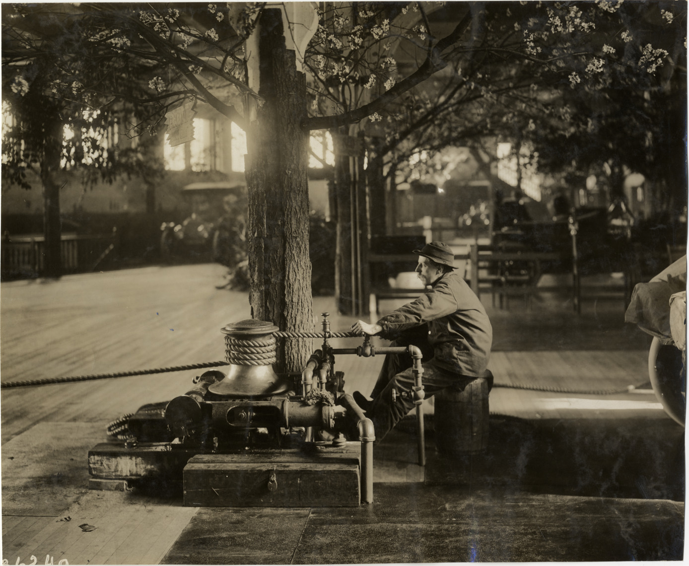 View of man operating a winch during the 1910 Boston Auto Show at Mechanics Hall in Boston, Massachusetts. Exhibit area is decorated with artificial flowering trees. Stamped on back: "Spooner & Wells, Inc., photographers, telephones 3472-3473 Columbus, 1931 Broadway, New York." Handwritten on back: "Shows--Boston Auto Show, 1910."