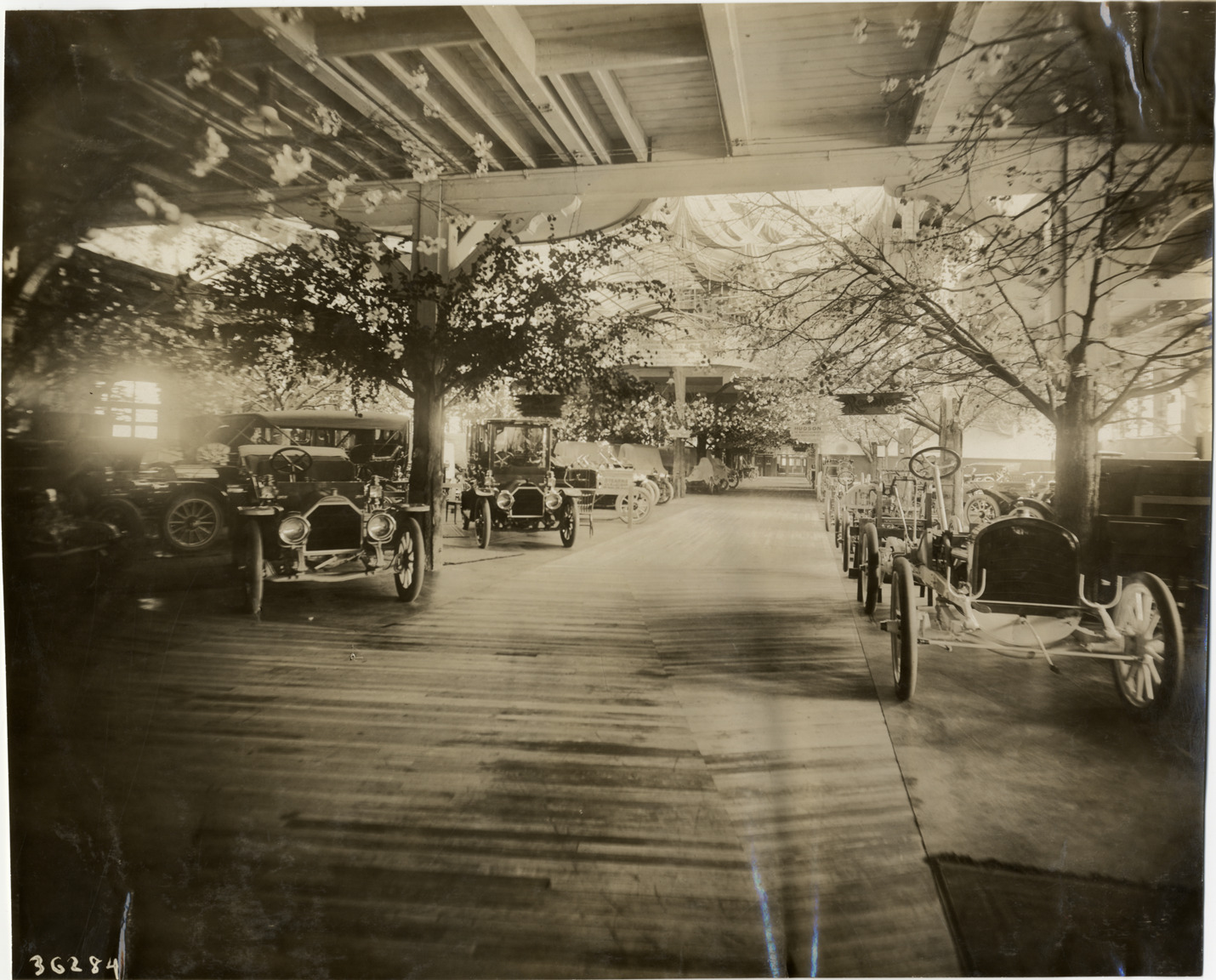 View of cars on exhibit during the 1910 Boston Auto Show at Mechanics Hall in Boston, Massachusetts. Exhibit area is decorated with artificial flowering trees. Stamped on back: "Spooner & Wells, Inc., photographers, telephones 3472-3473 Columbus, 1931 Broadway, New York." Handwritten on back: "Shows--Boston Auto Show, 1910."
