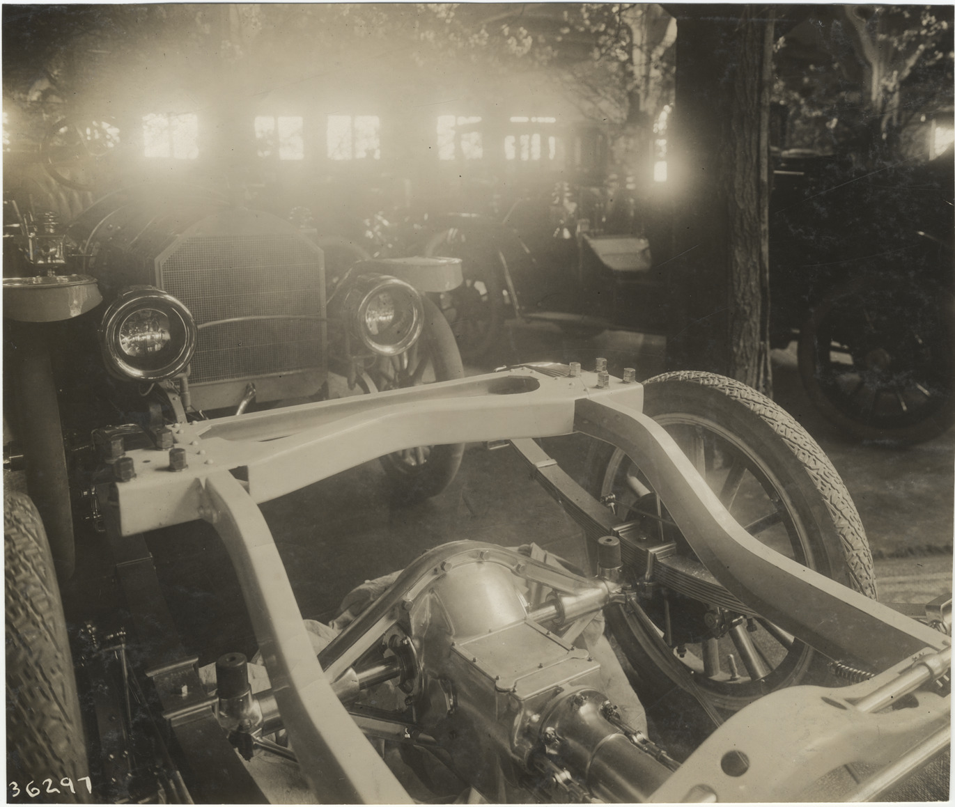 Close-up view of rear axle of car during the 1910 Boston Auto Show at Mechanics Hall in Boston Massachusetts. Cars in background. Stamped on back: "Spooner & Wells, Inc., photographers, telephones 3472-3473 Columbus, 1931 Broadway, New York." Handwritten on back: "Shows--Boston Auto Show, 1910."