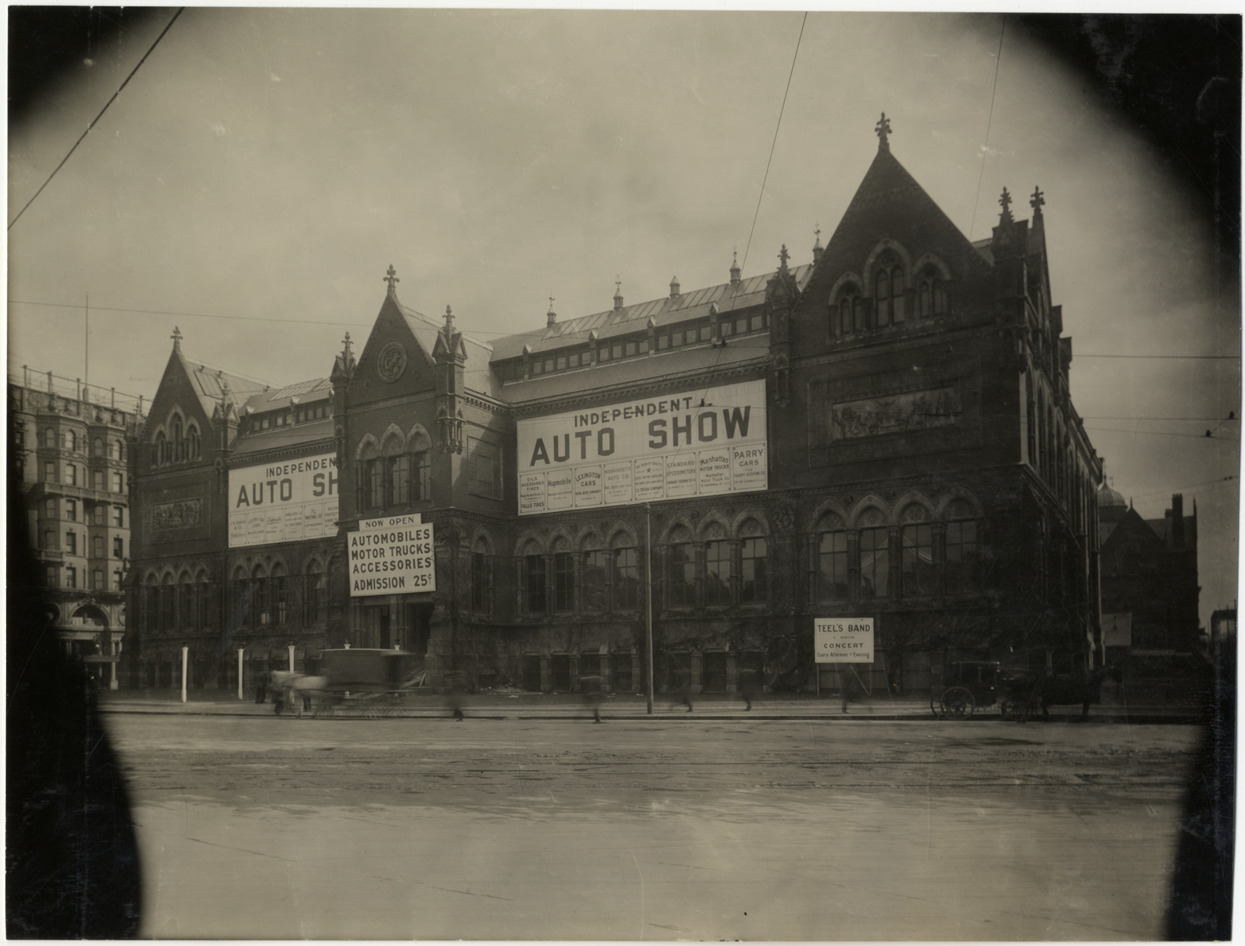 View of signs for the 1910 Independent Auto Show displayed on the old Boston Art Museum building at Copley Square in Boston, Massachusetts. This show, for dealers who were unable to secure space in Mechanics Hall, took place during the same week as the Boston Auto Show. "Independent Auto Show," "Now open, automobiles, motor trucks, accessories, admission, 25 [cents]" and "Teel's Band of Boston" signs displayed on building. Stamped on back: "Spooner & Wells, Inc., photographers, telephones 3472-3473 Columbus, 1931 Broadway, New York." Handwritten on back: "Shows--Boston Auto Show, 1910."