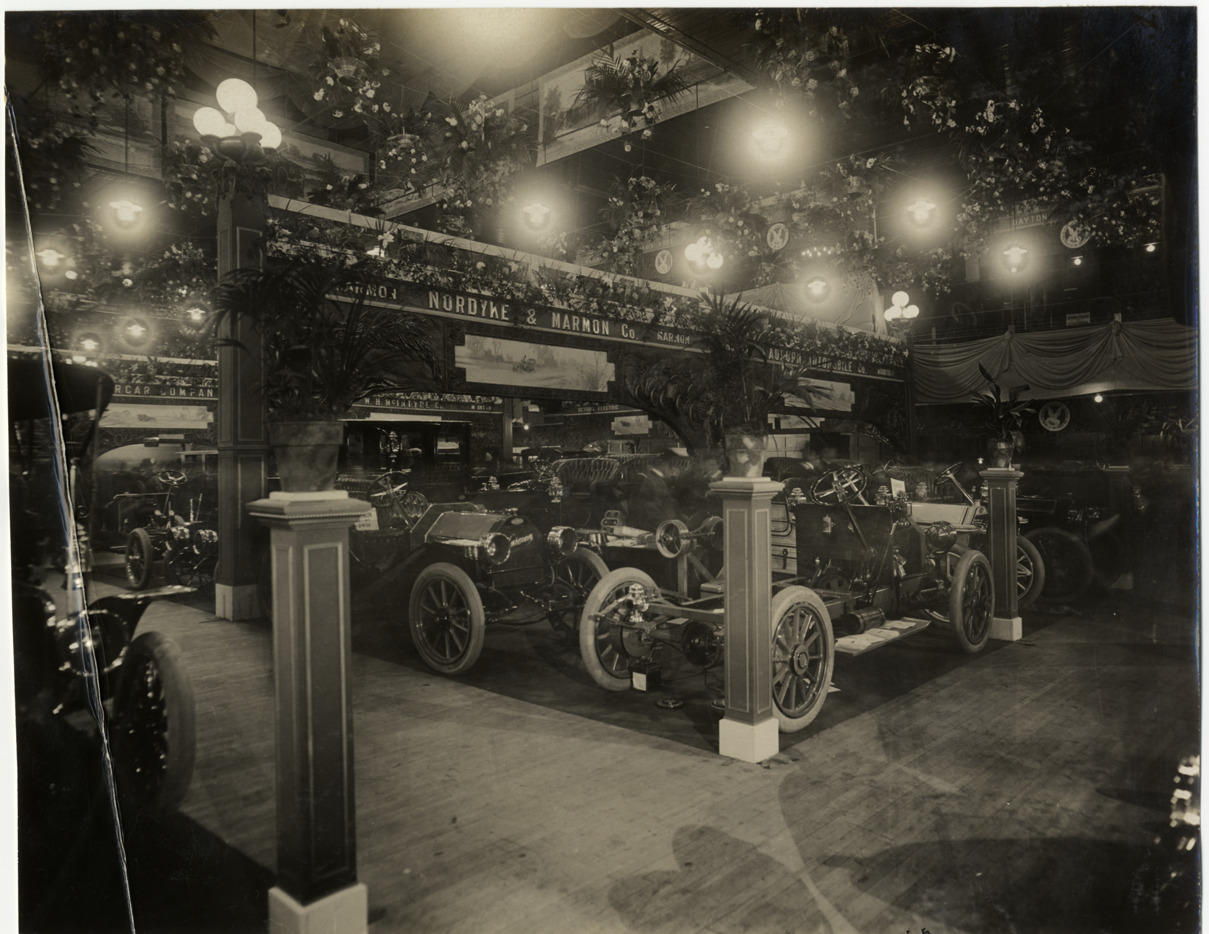 View of Marmon cars in Nordyke & Marmon Company exhibit during the 1909 Chicago Auto Show at the Coliseum and First Regiment Armory in Chicago, Illinois. "Marmon, Nordyke & Marmon Company" sign behind exhibit in background. Potted plants on columns in foreground. Handwritten on back: "Shows--Chicago Auto Show, 1909."