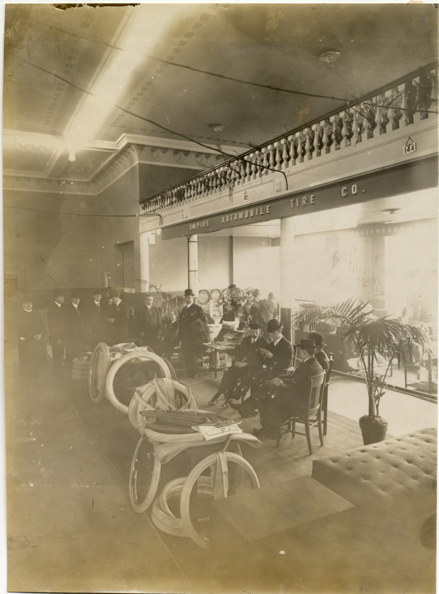 Men in Empire Automobile Tire Company exhibit, 1909 Chicago Auto Show