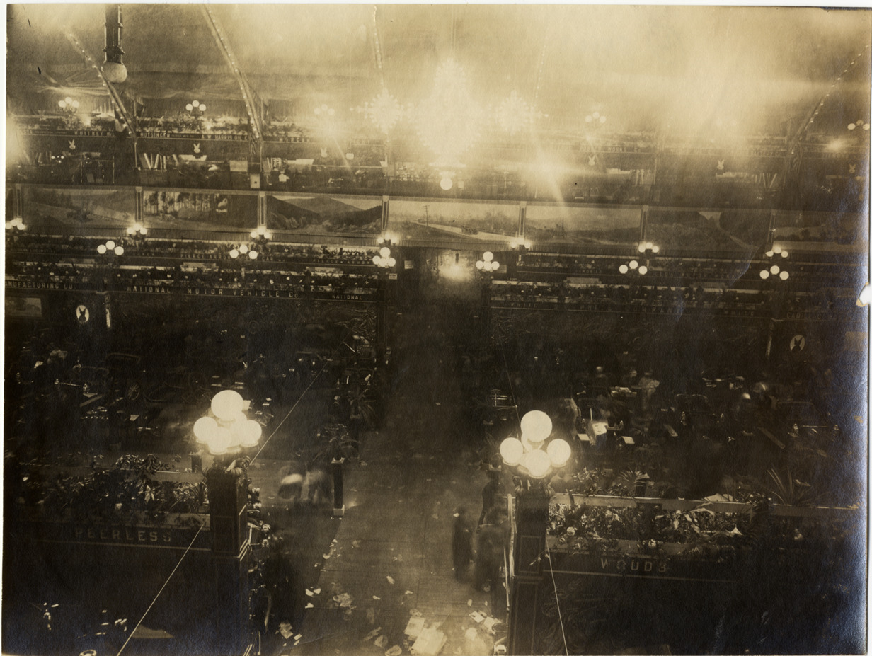 Nighttime view of exhibits during the 1909 Chicago Auto Show at the Coliseum and First Regiment Armory in Chicago, Illinois. Exhibit area is illuminated by electric lights. Handwritten on back: "Shows--Chicago Auto Show, 1909."