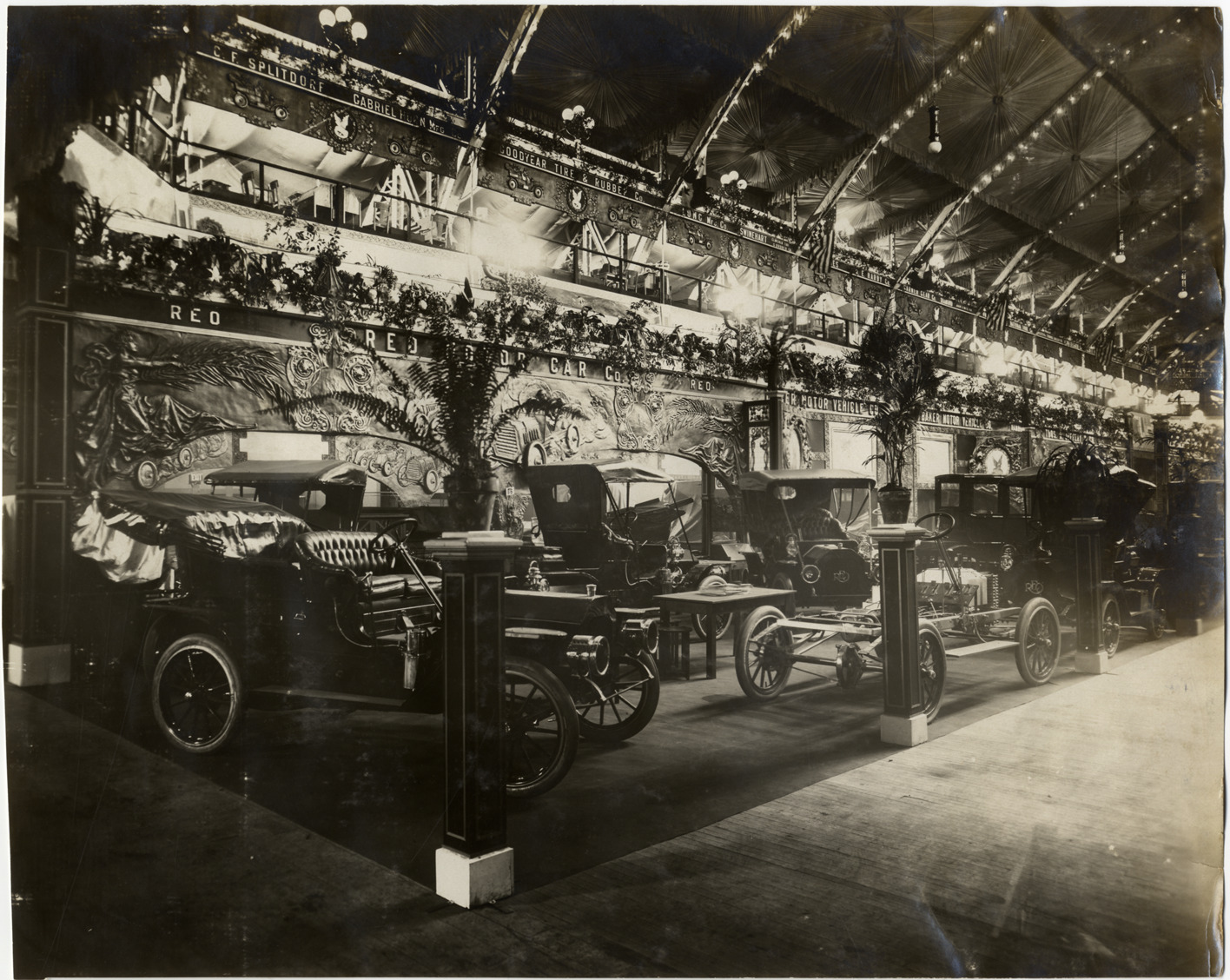 View of Reo cars on exhibit during the 1909 Chicago Auto Show at the Coliseum and First Regiment Armory in Chicago, Illinois. "Reo Motor Car Co." sign and relief of racecars in background. Potted plants on columns in foreground. Stamped on back: "Spooner & Wells, Inc., photographers, telephones 3472-3473 Columbus, 1931 Broadway, New York." Handwritten on back: "Shows--Chicago Auto Show, 1909."