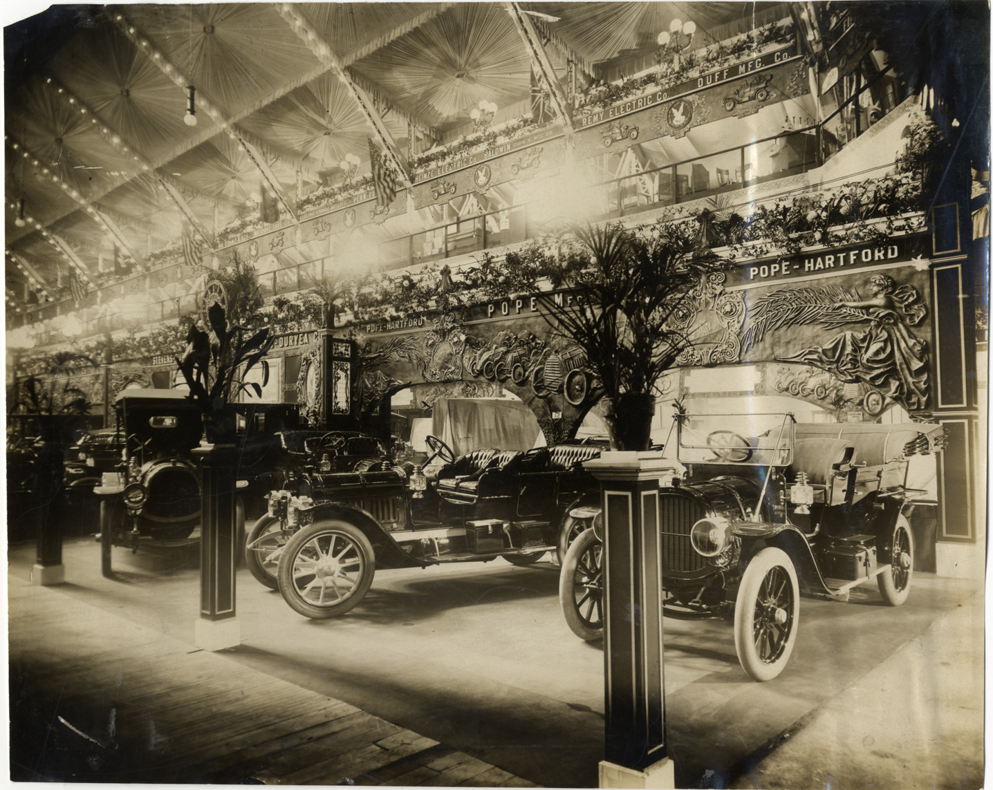 View of Pope-Hartford cars on exhibit during the 1909 Chicago Auto Show at the Coliseum and First Regiment Armory in Chicago, Illinois. "Pope-Hartford, Pope Mfg. Co." sign and relief of racecars in background. Potted plants on columns in foreground. Stamped on back: "Spooner & Wells, Inc., photographers, telephones 3472-3473 Columbus, 1931 Broadway, New York." Handwritten on back: "Shows--Chicago Auto Show, 1909."