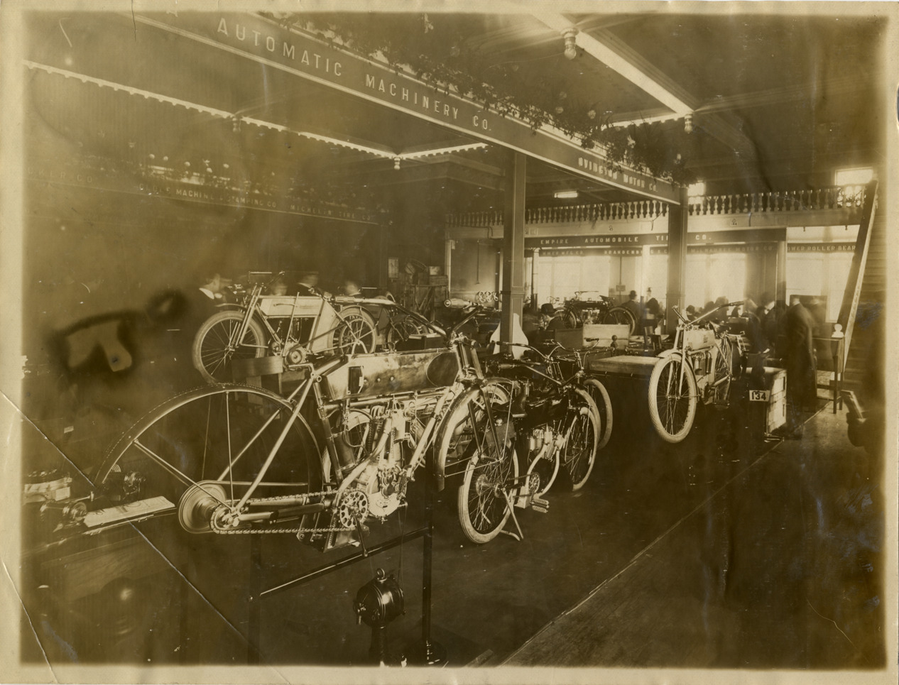 View of motorcycles in Aurora Automatic Machinery Company and Ovington Motor Company exhibits during the 1909 Chicago Auto Show at the Coliseum and First Regiment Armory in Chicago, Illinois. "Aurora Automatic Machinery Co." and "Ovington Motor Co." signs over exhibit. Handwritten on back: "Shows--Chicago Auto Show, 1909."