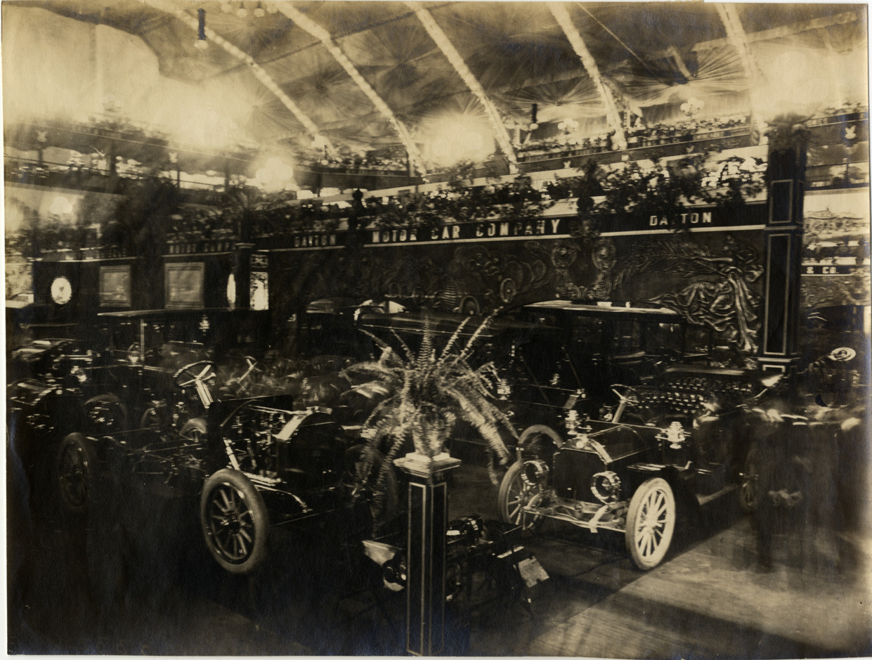 View of Stoddard-Dayton cars on exhibit during the 1909 Chicago Auto Show at the Coliseum and First Regiment Armory in Chicago, Illinois. "Dayton Motor Car Company" sign and relief of automobiles over display. Fern on column in foreground. Handwritten on back: "Shows--Chicago Auto Show, 1909."