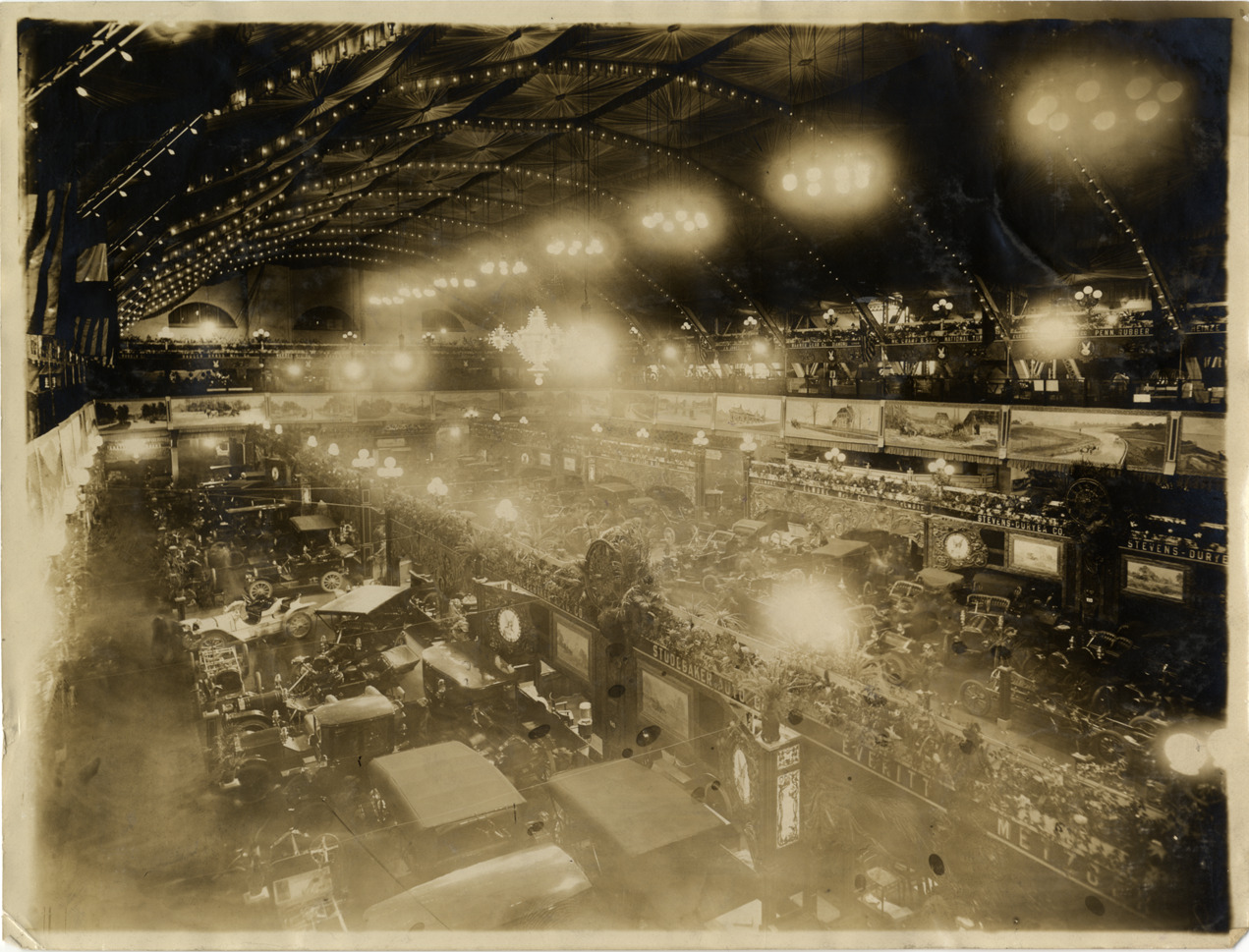 Nighttime view of cars on exhibit during the 1909 Chicago Auto Show at the Coliseum and First Regiment Armory in Chicago, Illinois. Ceiling and displays are illuminated with electric lights. Stamped on back: "Spooner and Wells, 1931 Broadway, New York, duplicates any time, enlargements all sizes, tel. 3472-3473 Col., credit appreciated." Handwritten on back: "Shows--Chicago Auto Show, 1909."