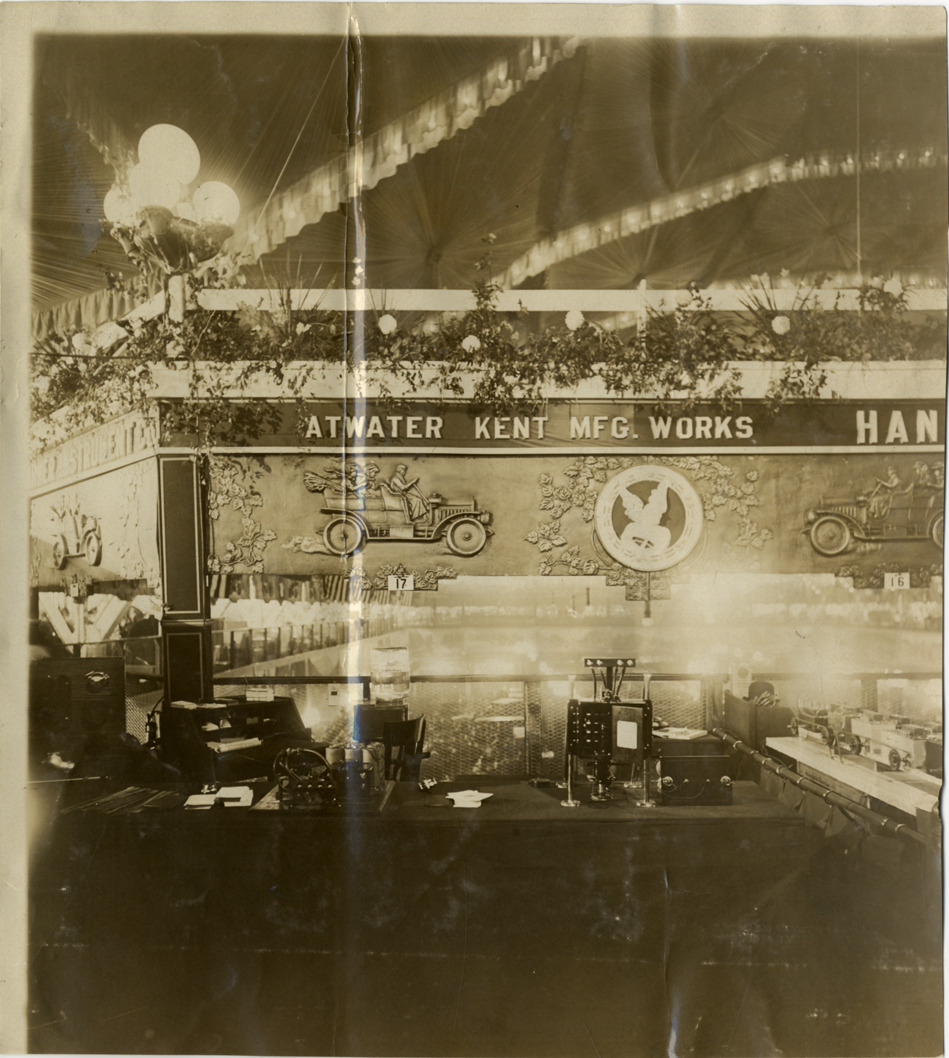 View of Atwater Kent Manufacturing Works exhibit during the 1909 Chicago Auto Show at the Coliseum and First Regiment Armory in Chicago, Illinois. "Atwater Kent Mfg. Works" sign and relief of automobiles in background. Stamped on back: "Spooner & Wells, Inc., photographers, telephones 3472-3473 Columbus, 1931 Broadway, New York." Handwritten on back: "Shows--Chicago Auto Show, 1909."