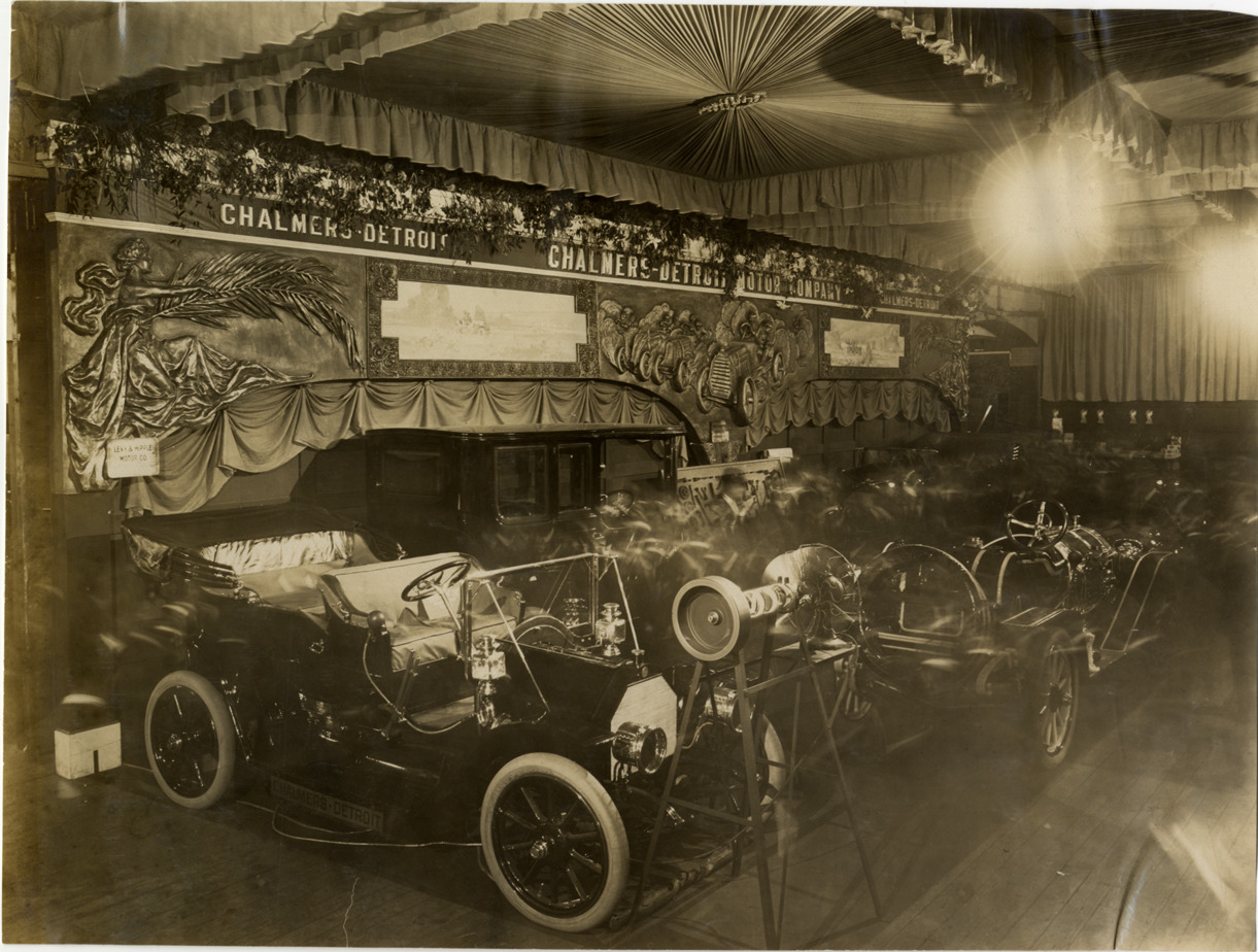 View of Chalmers-Detroit cars on exhibit during the 1909 Chicago Auto Show at the Coliseum and First Regiment Armory in Chicago, Illinois. "Chalmers-Detroit Motor Company" sign and relief of racecars in background. Stamped on back: "Spooner & Wells, Inc., photographers, telephones 3472-3473 Columbus, 1931 Broadway, New York." Handwritten on back: "Shows--Chicago Auto Show, 1909."
