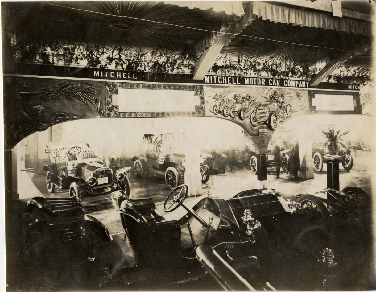 View of Mitchell cars on exhibit during the 1909 Chicago Auto Show at the Coliseum and First Regiment Armory in Chicago, Illinois. "Mitchell Motor Car Company" sign and relief of racecars over display. Handwritten on back: "Shows--Chicago Auto Show, 1909."
