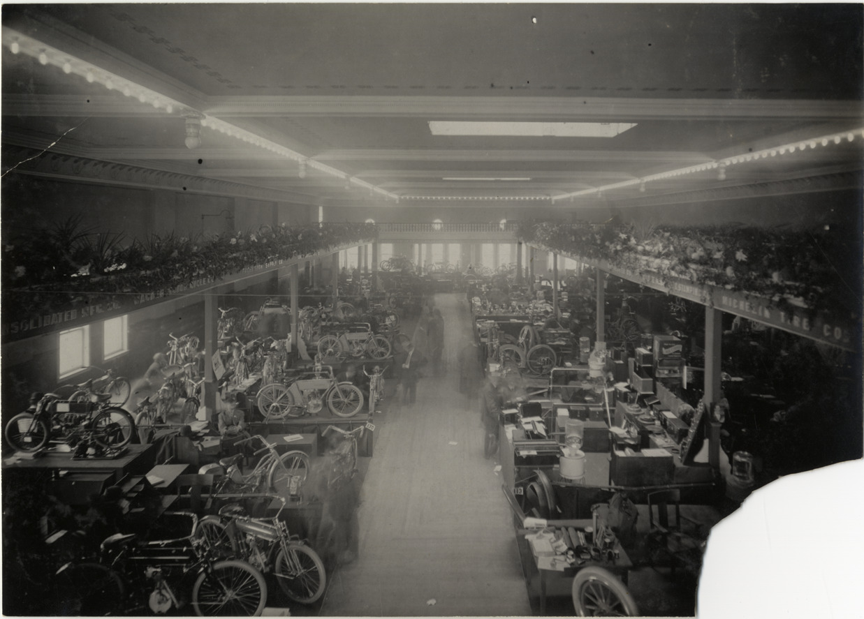 Bird's-eye view of motorcycles on exhibit during the 1909 Chicago Auto Show at the Coliseum and First Regiment Armory in Chicago, Illinois. Stamped on back: "Spooner and Wells, 1931 Broadway, New York, duplicates any time, enlargements all sizes, tel. 3472-3473 Col., credit appreciated." Handwritten on back: "Shows--Chicago Auto Show, 1909."