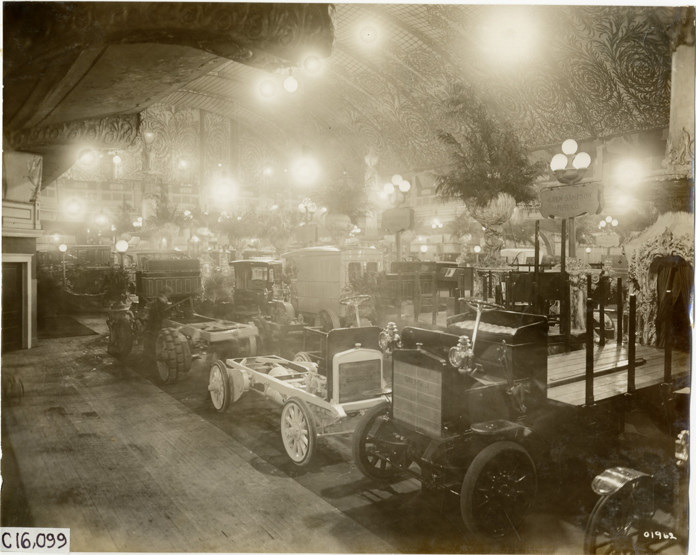 View of Alden Sampson Manufacturing Company exhibit of trucks during the 1911 Chicago Auto Show at the Coliseum in Chicago, Illinois. "Alden Sampson Mfg. Co." sign in background. Handwritten on back: "Alden Sampson. Shows--Chicago Auto Show, 1911."