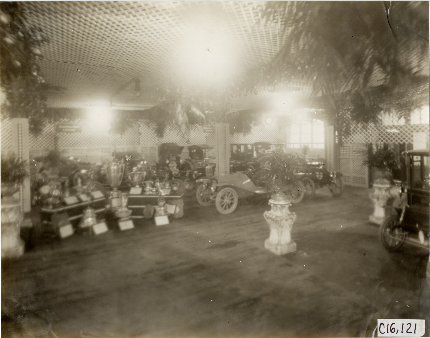 View of cars and trophies on exhibit during the 1911 Chicago Auto Show at the Coliseum in Chicago, Illinois. Potted plants on pedestals in foreground. Handwritten on back: "Shows--Chicago Auto Show, 1911."