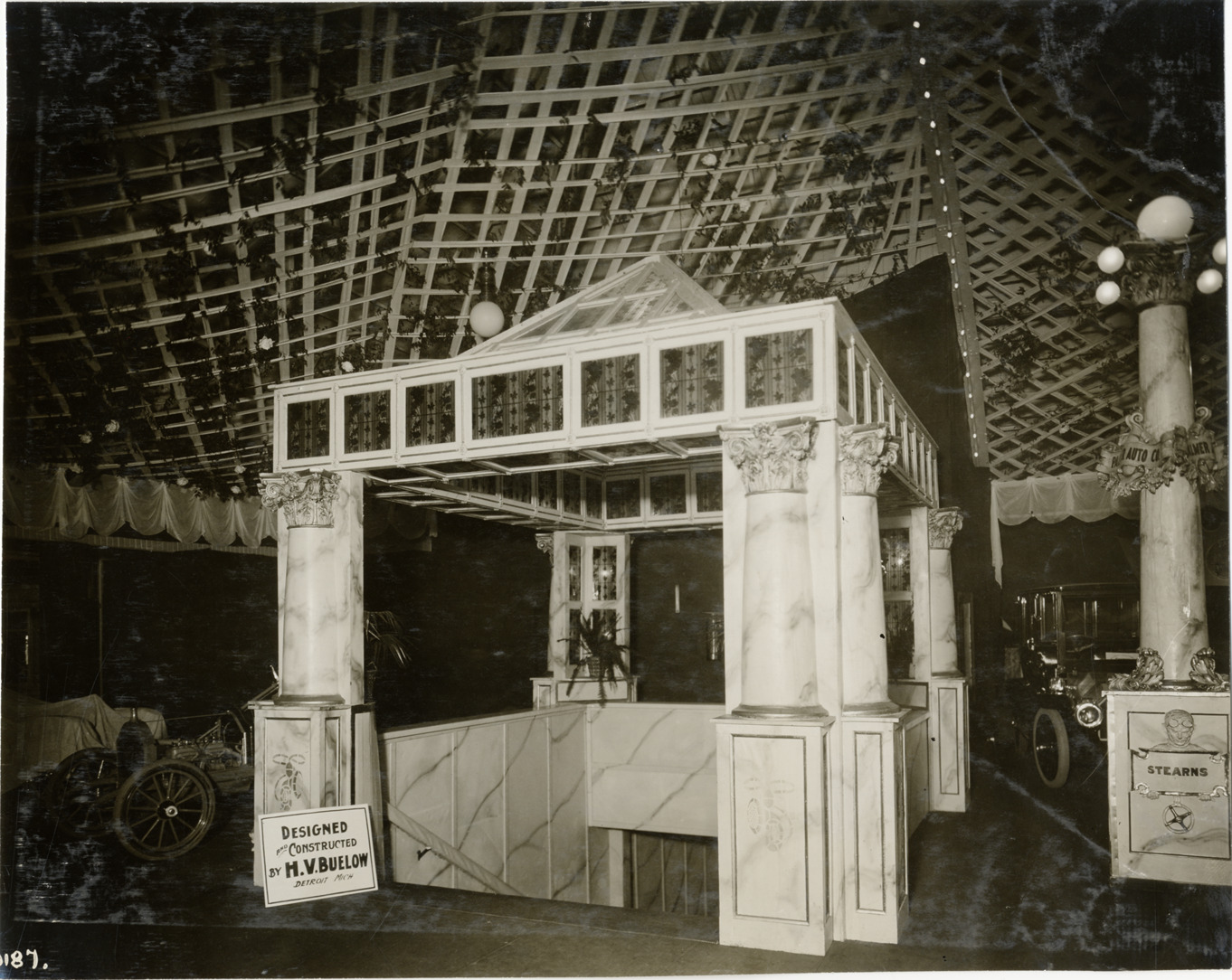 View of decorative pavilion over staircase during the 1910 Detroit Auto Show at the Wayne Hotel Gardens in Detroit, Michigan. Sign in front of stairs reads: "Designed and constructed by H.V. Buelow, Detroit, Mich." Corinthian pilasters decorate pavilion. Stamped on back: "Spooner & Wells, Inc., photographers, telephone North 1745. 1231 Woodward Ave., Detroit, Mich. Detroit, 1231 Woodward, New York, 1931 Broadway." Handwritten on back: "1910 Detroit Auto Show. Shows--Detroit Auto Show, 1910."