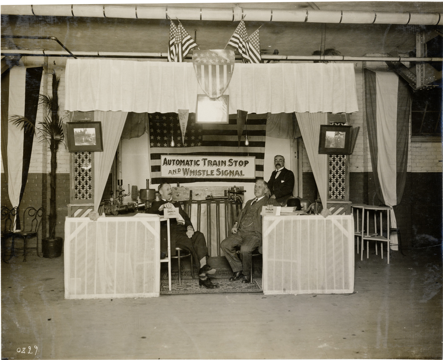 View of men in Railway Automatic Safety Appliance Company exhibit during the 1910 Detroit Auto Show at the Wayne Hotel Gardens in Detroit, Michigan. "Automatic train stop and whistle signal" sign displayed in background; booth is decorated with shield and American flags. Handwritten on back: "Shows--Detroit Auto Show, 1910."