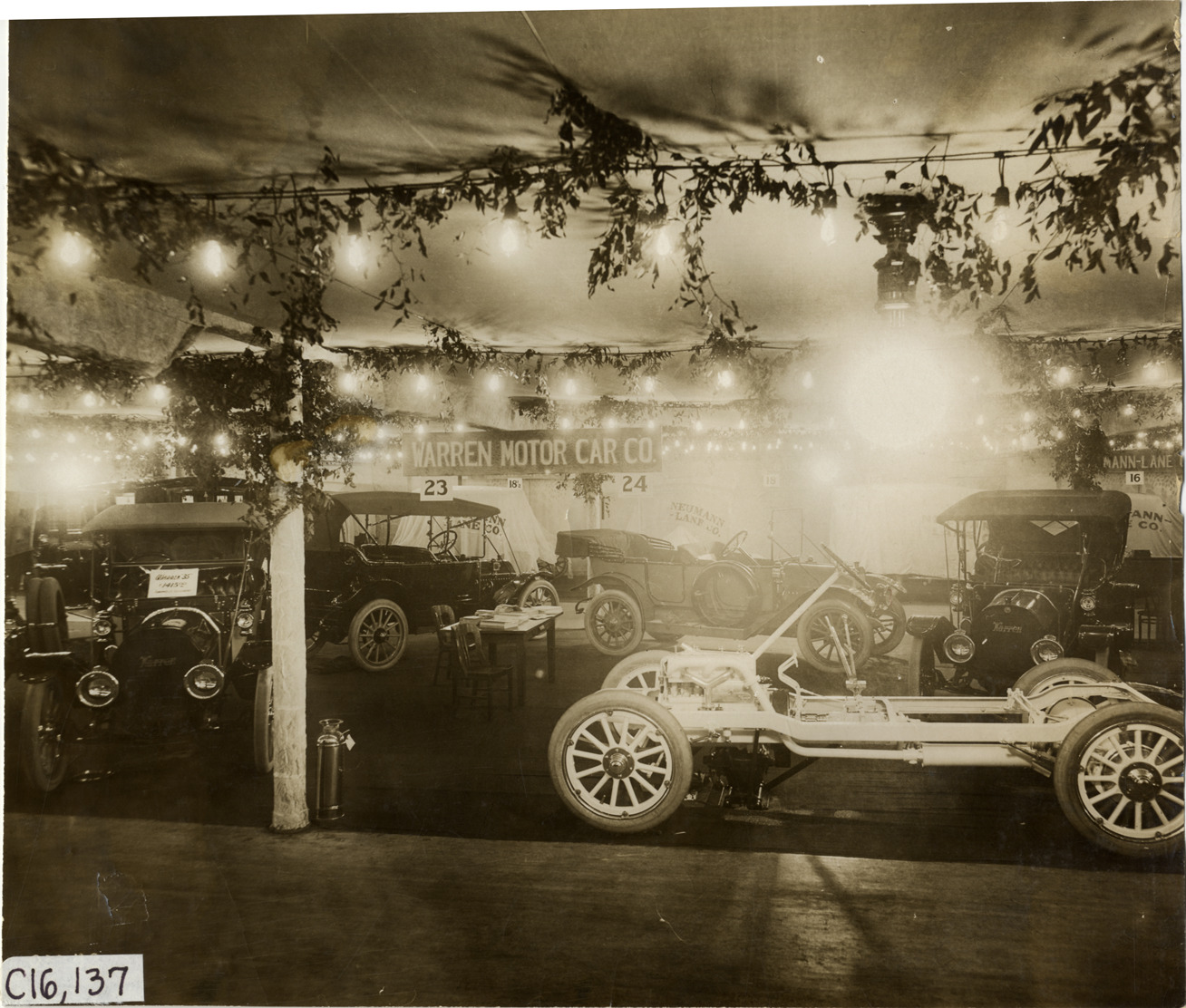 View of Warren cars and chassis on exhibit during the 1912 Detroit Auto Show at the Wayne Gardens in Detroit, Michigan. "Warren Motor Car Co." sign in background. Handwritten on back: "Shows--Detroit Auto Show, 1912."