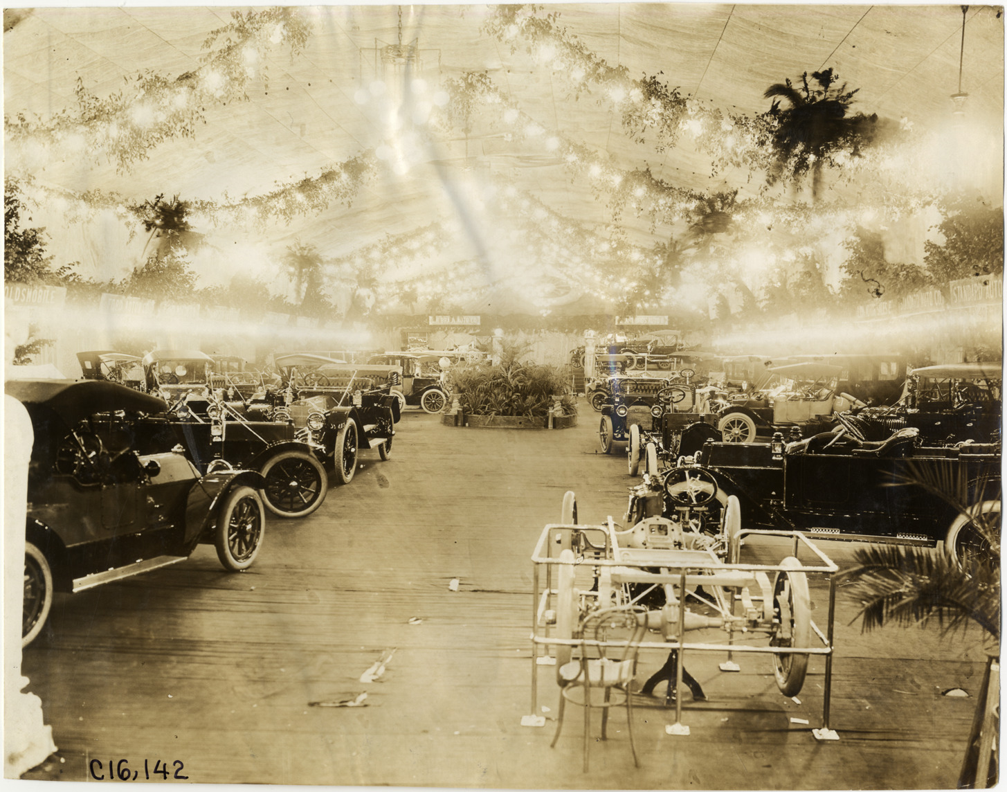 View of cars and chassis on exhibit during the 1912 Detroit Auto Show at the Wayne Gardens in Detroit, Michigan. Ceiling is decorated with electric lights and garlands. Stamped on back: "Spooner & Wells, Inc., photographers, telephone North 1745. 1231 Woodward Ave., Detroit, Mich. Detroit, 1231 Woodward, New York, 1931 Broadway." Handwritten on back: "Shows--Detroit Auto Show, 1912."