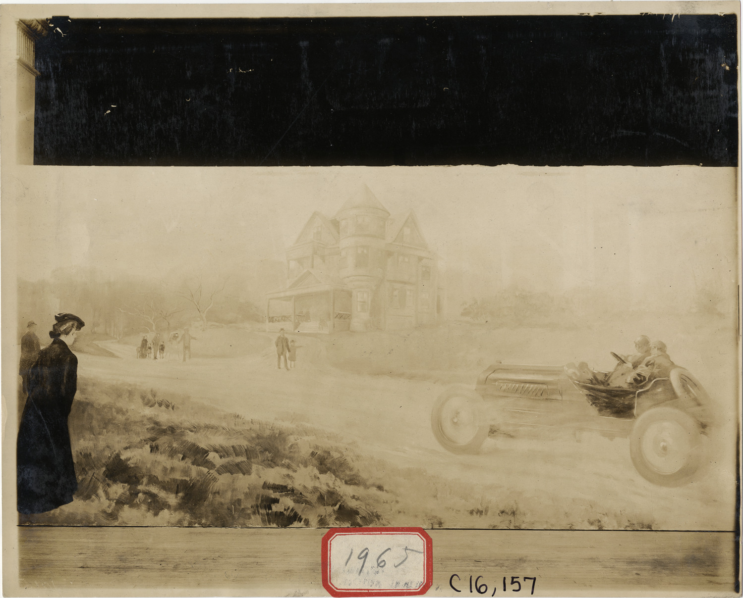 Painting by the artist Pal (Jean de Paleologue) of driver and passenger racing car past spectators; displayed at the 1905 Importers' Salon at Herald Square Hall in New York. Handwritten on back: "Herald Square Hall, Macy Bldg., painting by Pal. Shows--Importers Salon, New York, 1905."