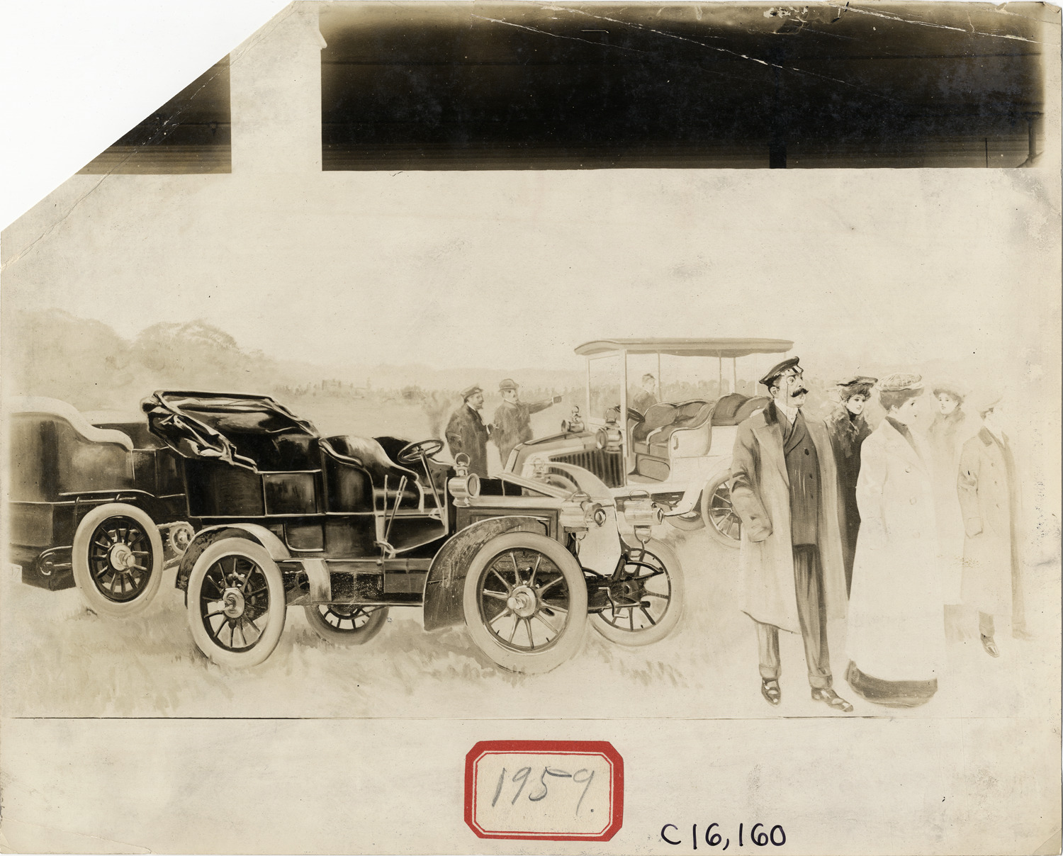 Painting by the artist Pal (Jean de Paleologue) of automobile racing spectators, with their cars on roadside; displayed at the 1905 Importers' Salon at Herald Square Hall in New York. Handwritten on back: "Herald Square Hall, Macy Bldg., painting by Pal. Shows--Importers Salon, New York, 1905."