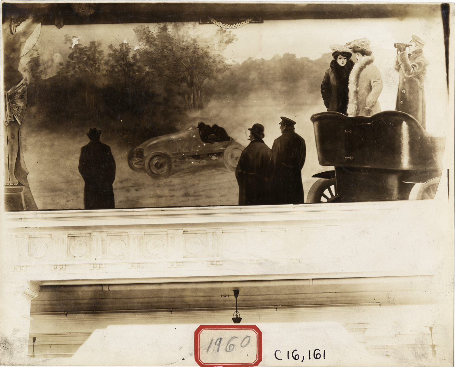 Painting by the artist Pal (Jean de Paleologue) of automobile racing spectators, with their car, watching racecar; displayed at the 1905 Importers' Salon at Herald Square Hall in New York. Handwritten on back: "Herald Square Hall, Macy Bldg., painting by Pal. Shows--Importers Salon, New York, 1905."